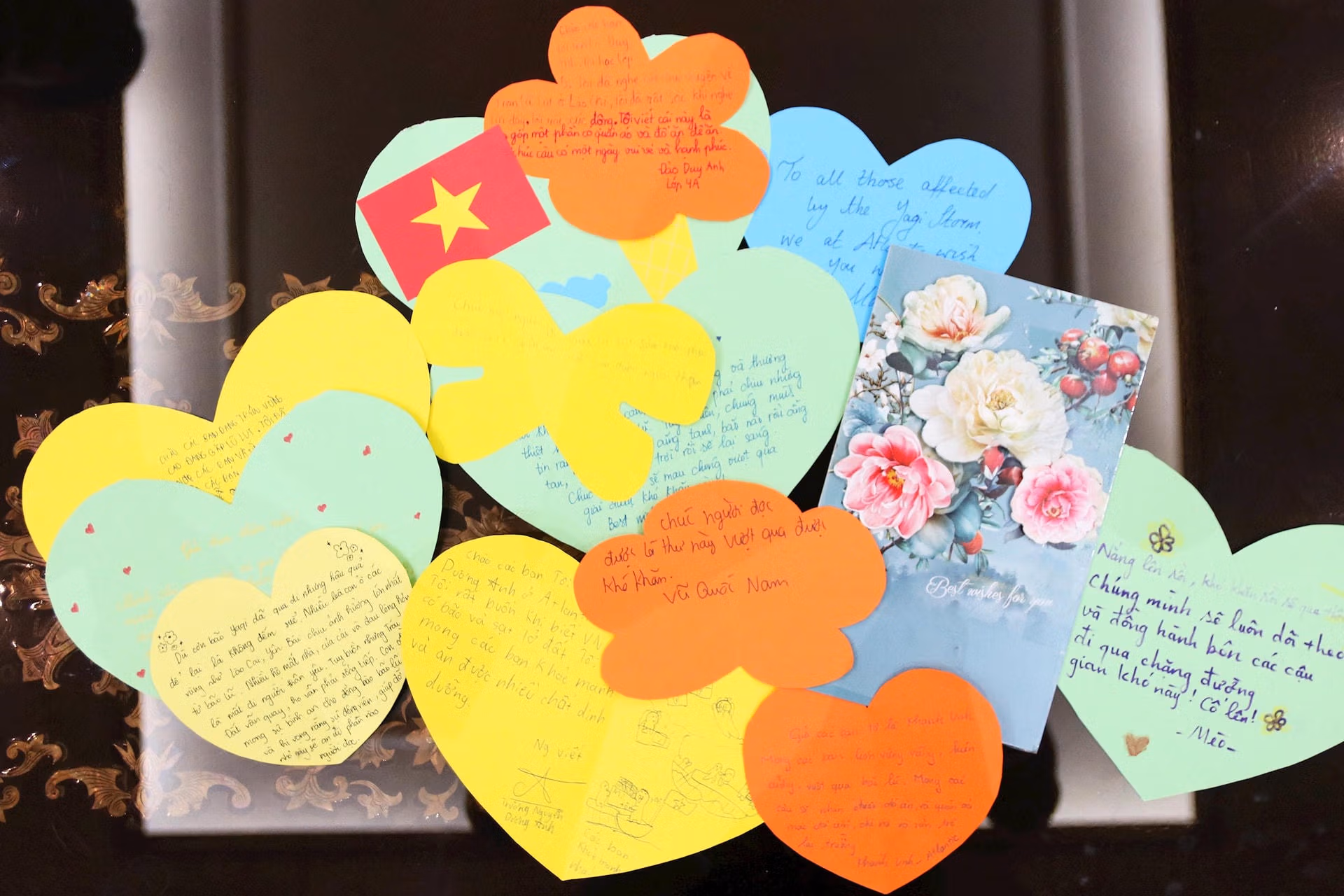 Một bạn tên Mèo có viết " Nắng lên rồi, khó khăn rồi sẽ qua thôi. Chúng mình sẽ luôn dõi theo và đồng hành bên các cậu đi qua chặng đường gian khó này. Cố lên!". Những lá thư được xếp ngay ngắn, trang trí đủ màu sắc, chứa đựng những tâm tình gửi gắm tới học sinh vùng bão lũ.