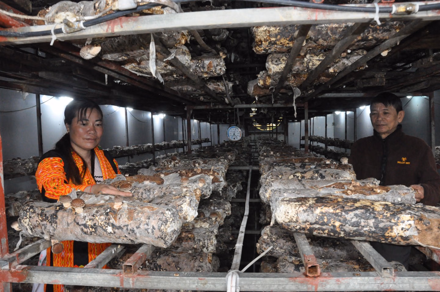 Gia đình chị Đặng Điến, thôn Khuổi Tẳng là một trong những hộ tham gia dự án, được cấp 1.000 bịch phôi nấm. Trong nhà trồng kín, chị duy trì việc kiểm tra độ ẩm và chăm sóc phôi nấm hằng ngày. Theo yêu cầu kỹ thuật, độ ẩm dao động từ 80 - 90% là điều kiện lý tưởng để nấm phát triển. Không chỉ được hỗ trợ phôi giống, các hộ dân còn được cán bộ kỹ thuật hướng dẫn quy trình chăm sóc, thu hái và kỹ thuật tỉa nấm để đảm bảo nấm ra đều, đạt chất lượng cao.
