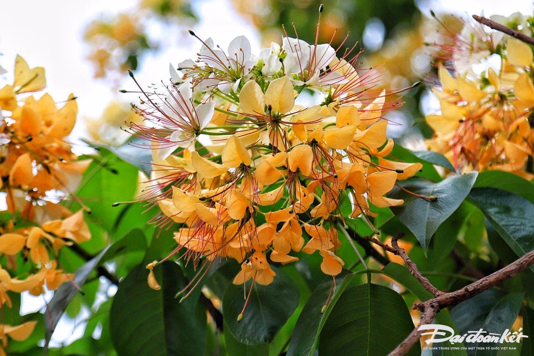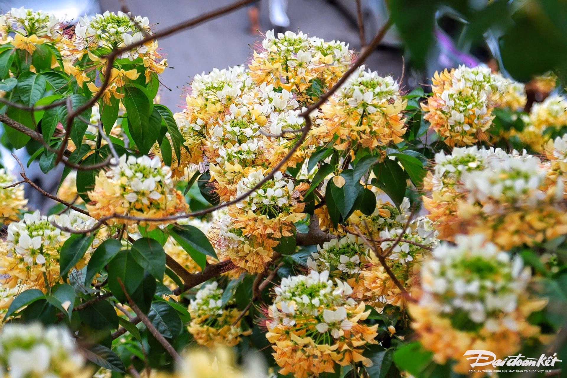 Ngắm cây hoa bún cổ hơn 300 tuổi nở rộ giữa lòng Hà Nội Thứ Tư 10/04/2024 12:51 (GMT+7) Những ngày đầu tháng 4, cây hoa bún được xem như là "báu vật" của người dân Đình Thôn (quận Nam Từ Liêm, Hà Nội) có tuổi đời hơn 300 năm đang nở rộ khoe sắc vàng rực cả một góc phố. Hoa bún là loại cây thân gỗ tán rộng, thường nở rộ vào cuối tháng 3, đầu tháng 4 sau đó thưa dần, nhưng đến lúc giao mùa sang hạ, mưa ẩm, cây lại bung lộc trổ hoa thành từng chùm to rất đẹp mắt. Cây hoa bún này có tuổi đời hơn 300 năm gắn bó với nhiều thế hệ người dân làng Đình Thôn. Vì vậy, cây hoa bún này được người dân xem như là "báu vật".Tại Hà Nội, cây hoa bún ở làng Đình Thôn là lâu đời nhất.Khi nở, nhụy hoa có hình dáng giống với sợi bún, bởi vậy người dân nơi đây gọi luôn là cây hoa bún.Cây bún là loại cây thân gỗ tán rộng, cao 15-20m, thân mập hình trụ tròn, phân thành nhiều cành, vỏ màu xám nâu.Cành hoa bún thường rất cong và dẻo dai.Hoa bún mọc thành từng chùm phía đầu cành, màu hoa vàng, trắng xen lẫn sắc xanh của lá.Cây hoa bún còn có tên gọi khác là Bạch hoa hay Màn Màn.Thời điểm hoa bún nở rộ thu hút nhiều bạn trẻ đến chụp ảnh.Cây bún nở hoa kín lối vào làng luôn là hình ảnh ấn tượng, đi vào tâm trí của nhiều thế hệ người dân nơi đây. Lê Khánh