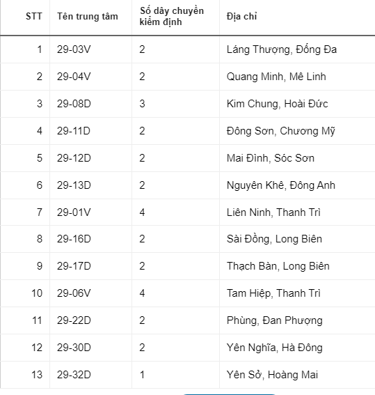 Danh sách 13 trung tâm đăng kiểm đang hoạt động tại Hà Nội như sau: