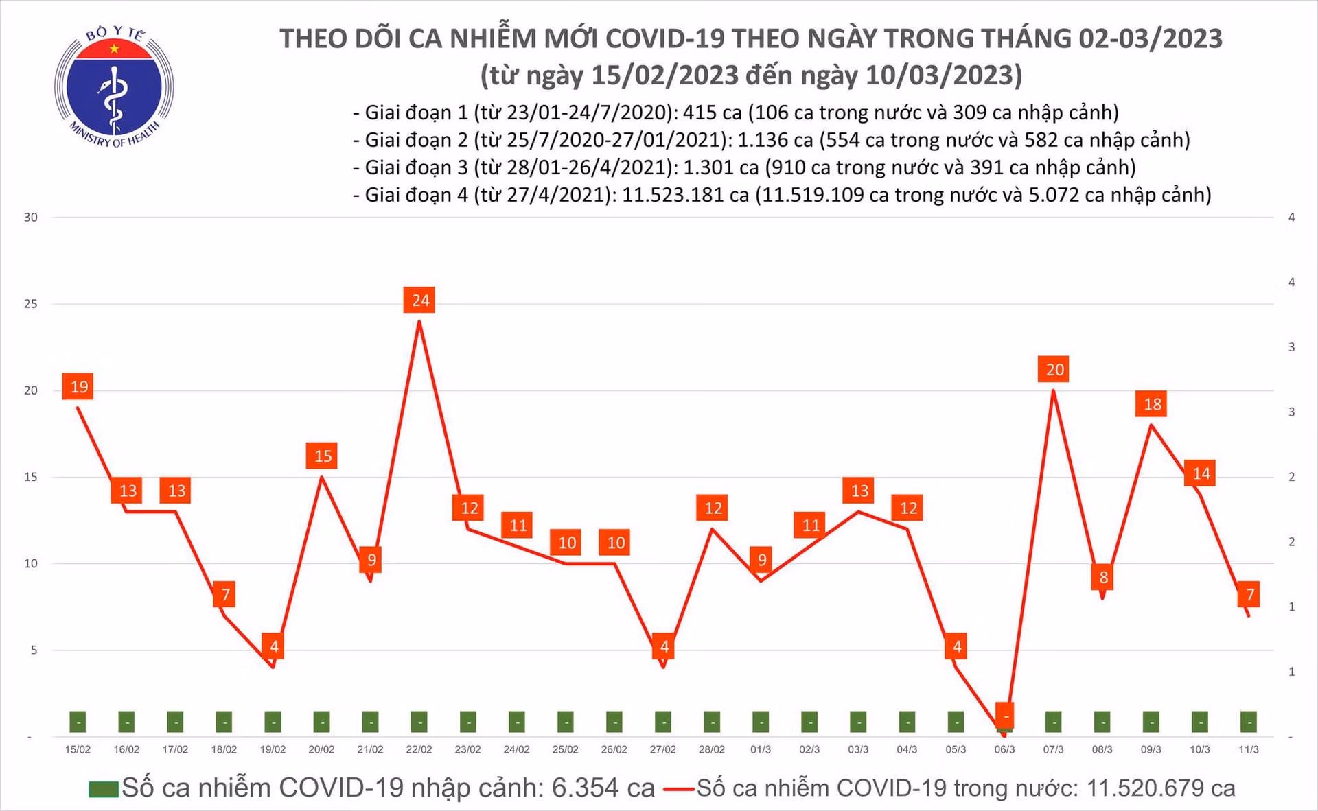 Bản tin phòng chống dịch Covid-19 ngày 11/3 của Bộ Y tế cho biết có 7 ca mắc mới, giảm 7 ca so với ngày trước đó; Hôm nay chỉ có 2 bệnh nhân khỏi và còn 1 ca nặng đang điều trị.