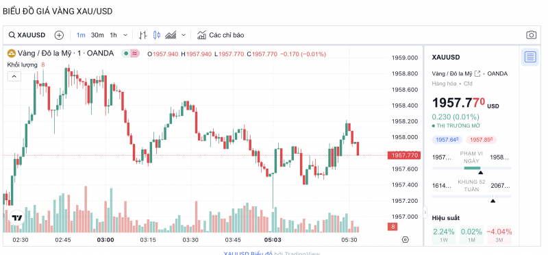 Theo Kitco, giá vàng thế giới giao ngay ở mức 1.957,77 USD/ounce. Trong khi đó, giá vàng kỳ hạn của Mỹ tăng 0,3% lên 1.937,10 USD.