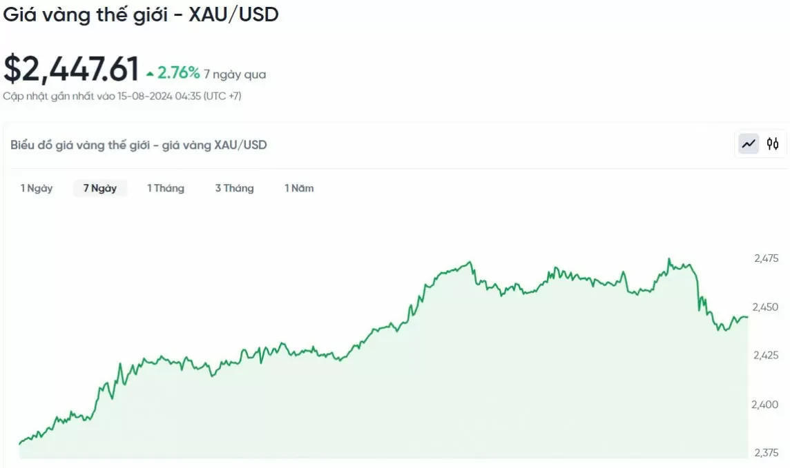 Theo Kitco, giá vàng thế giới ghi nhận lúc 5h hôm nay theo giờ Việt Nam giao ngay ở mức 2.447,61 USD/ounce. Giá vàng hôm nay giảm 17,28 USD so với giá vàng ngày hôm qua. Quy đổi theo tỷ giá hiện hành tại Vietcombank, vàng thế giới có giá khoảng 72,978 triệu đồng/lượng (chưa tính thuế, phí). Như vậy, giá vàng miếng của SJC vẫn đang cao hơn giá vàng quốc tế là 5,022 triệu đồng/lượng.
