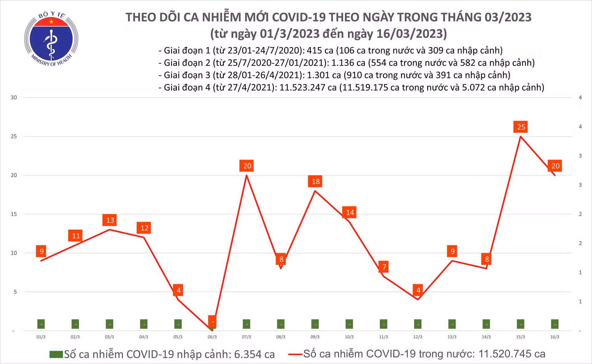 Bản tin phòng chống dịch Covid-19 ngày 16/3 của Bộ Y tế cho biết, có 20 ca mắc mới, nhiều gấp hơn 3 lần bệnh nhân khỏi. Hiện có 5 bệnh nhân nặng đang điều trị, tăng gấp 5 lần so với ngày hôm qua.