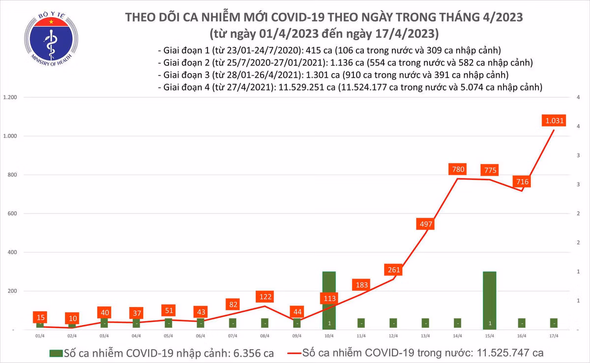 Bản tin phòng chống dịch Covid-19 ngày 17/4 của Bộ Y tế cho biết có 1.031 ca mắc mới Covid-19. Đây là ngày có số ca mắc cao nhất trong khoảng gần 6 tháng qua; trong ngày có 2 bệnh nhân khỏi; 14 bệnh nhân đang thở oxy.