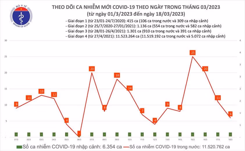 Bản tin phòng chống dịch Covid-19 của Bộ Y tế ngày 18/3 cho biết có 6 ca mắc Covid-19 mới, giảm nhẹ so với hôm qua; trong ngày có 6 bệnh nhân khỏi; Bệnh nhân nặng tăng lên.