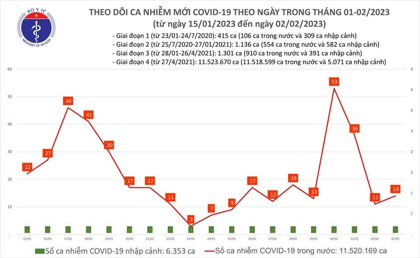 Bản tin phòng chống dịch Covid-19 ngày 2/2 của Bộ Y tế cho biết, có 14 ca mắc Covid-19, tăng nhẹ so với hôm qua. Đặc biệt hôm nay có đến 715 bệnh nhân khỏi, cao nhất trong khoảng vài tháng qua.