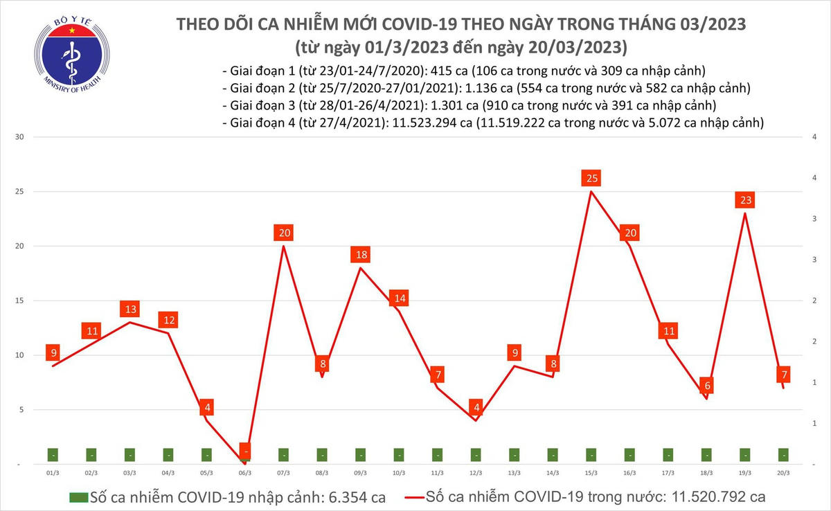 Bản tin phòng chống dịch Covid-19 ngày 20/3 của Bộ Y tế cho biết, có 7 ca mắc mới, giảm so với ngày trước đó; Trong ngày không có bệnh nhân nào khỏi; hiện còn 5 ca nặng đang thở oxy.