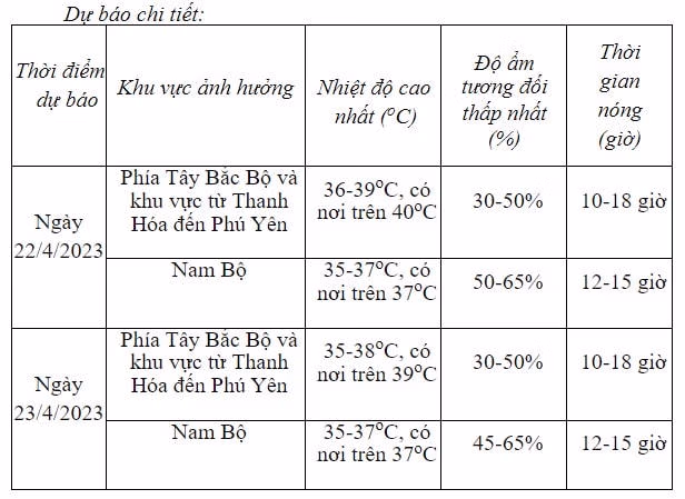 Theo Trung tâm Dự báo Khí tượng Thủy văn Quốc gia, ngày 22/4, phía Tây Bắc Bộ và khu vực từ Thanh Hóa đến Phú Yên có nắng nóng và nắng nóng gay gắt, với nhiệt độ cao nhất phổ biến 36-39 độ C, có nơi trên 40 độ C; độ ẩm tương đối thấp nhất phổ biến 30-50%.