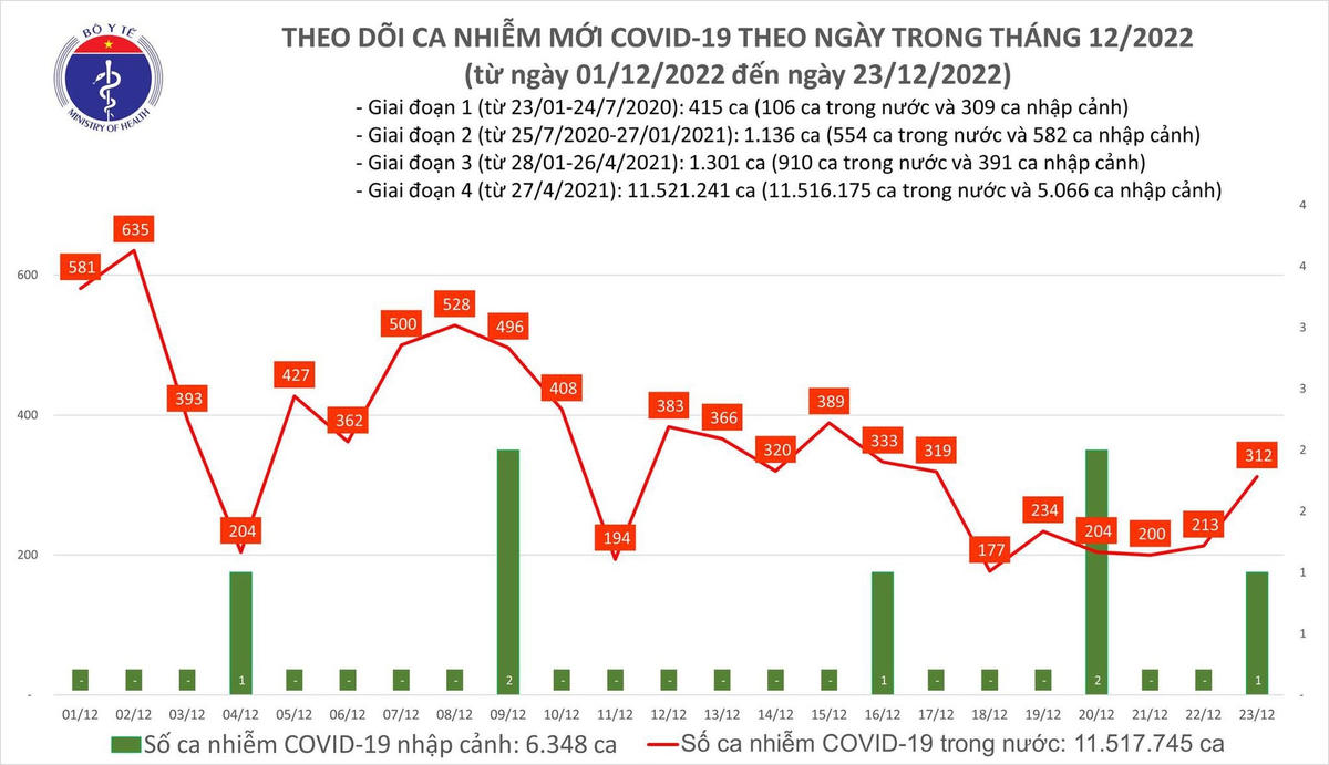 Bản tin phòng chống dịch Covid-19 ngày 23/12 của Bộ Y tế cho biết, có 312 ca mắc Covid-19, tăng thêm 100 ca so với ngày trước đó; trong ngày ghi nhận 2 bệnh nhân Covid-19 tử vong.