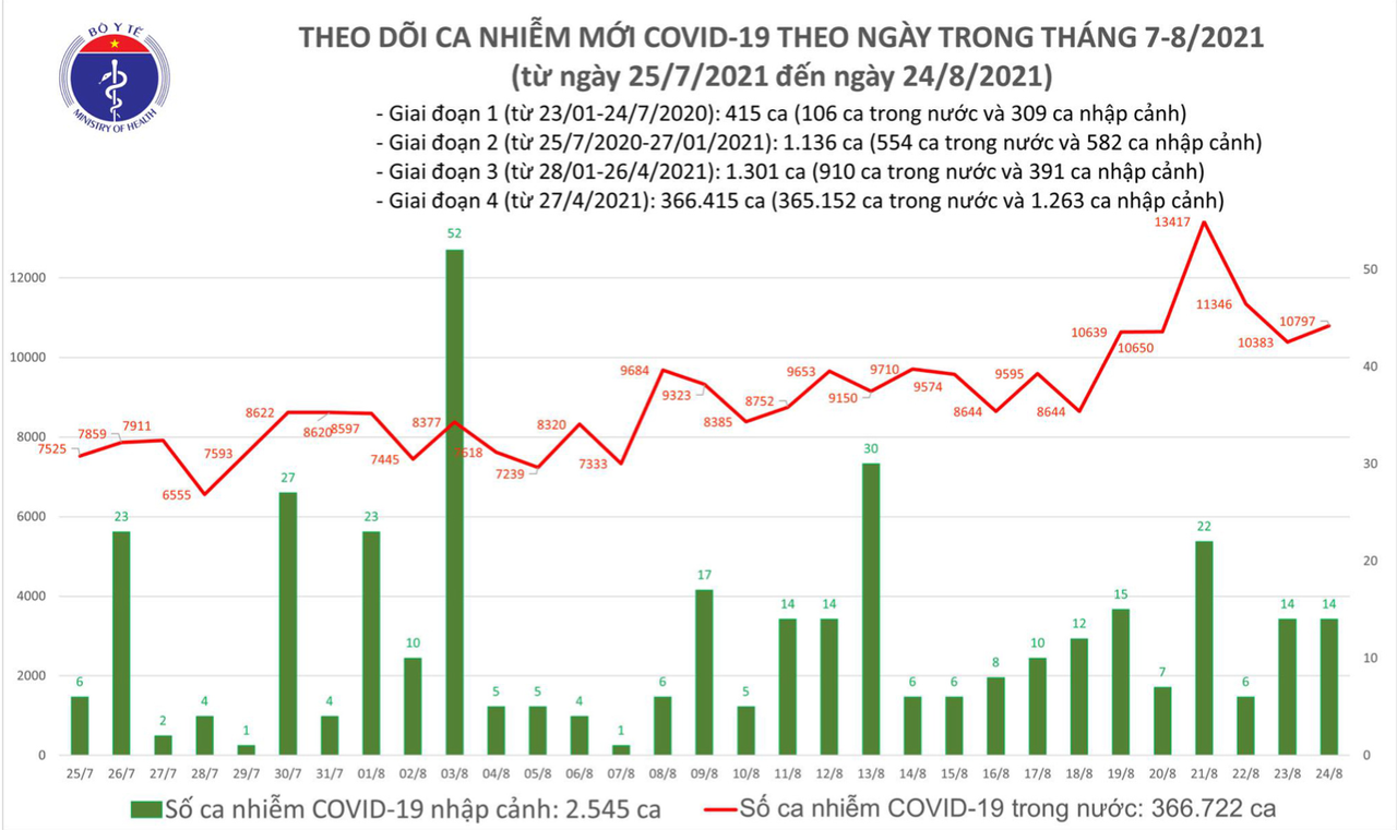 Bản tin dịch Covid-19 tối 24/8 của Bộ Y tế cho biết có 10.811 ca mắc Covid-19, trong đó TP Hồ Chí Minh và Bình Dương cộng lại đã 8.255 ca. Số còn lại ghi nhận ở 41 địa phương khác. Trong ngày có 7.663 bệnh nhân khỏi.