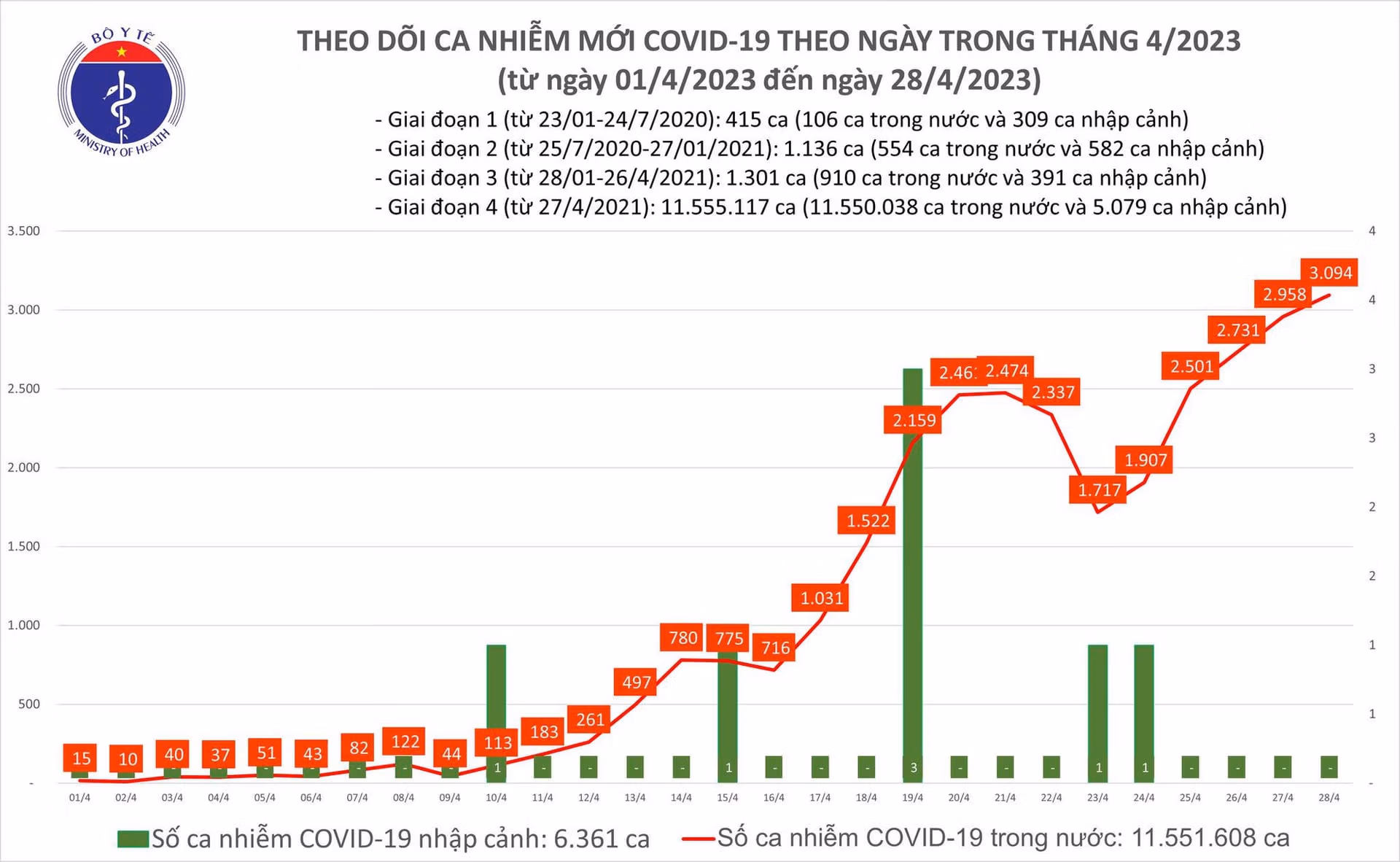 Ngày 28/4: Có 3.094 ca Covid-19, cao nhất trong hơn 6 tháng qua