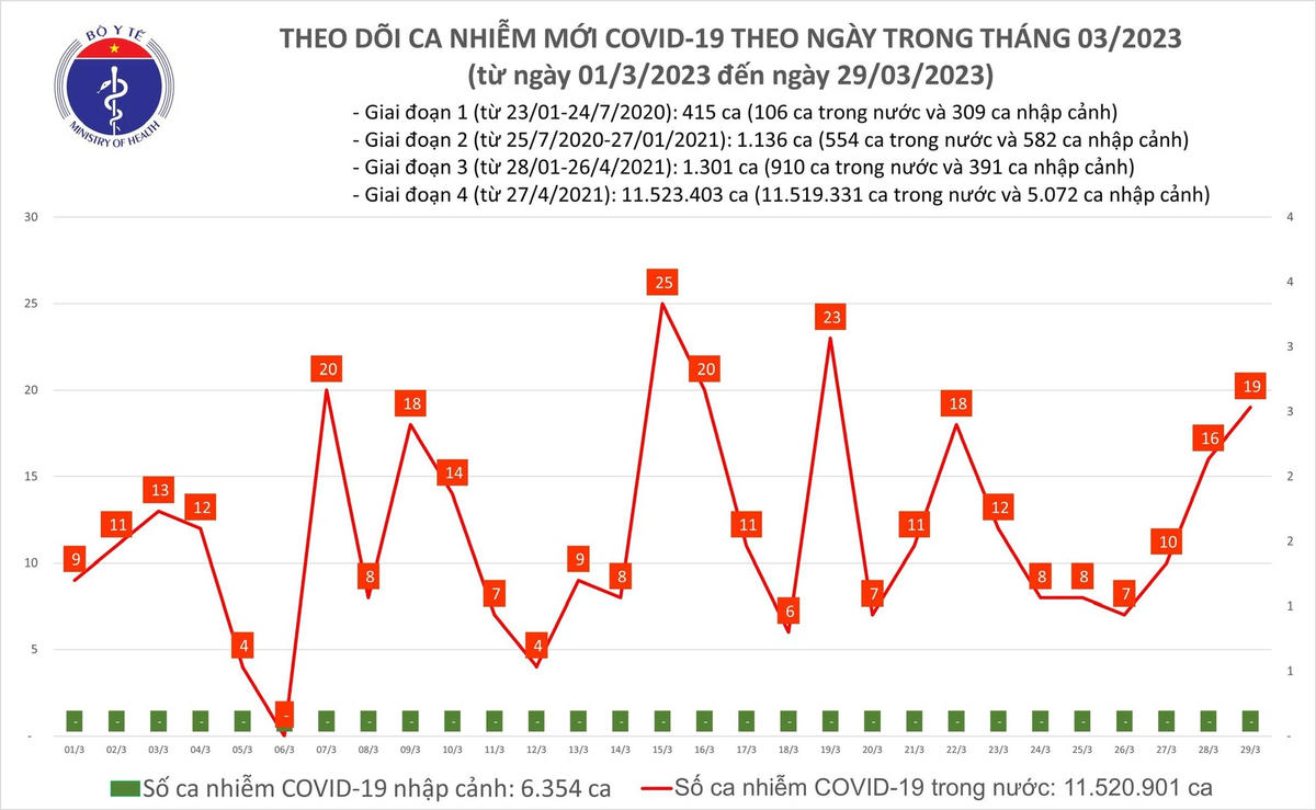 Bản tin phòng chống dịch Covid-19 ngày 29/3 của Bộ Y tế cho biết, có 19 ca mắc mới, tiếp đà tăng của các ngày trước đó; Hiện có 4 bệnh nhân nặng đang điều trị; Trong ngày có 5 bệnh nhân khỏi.