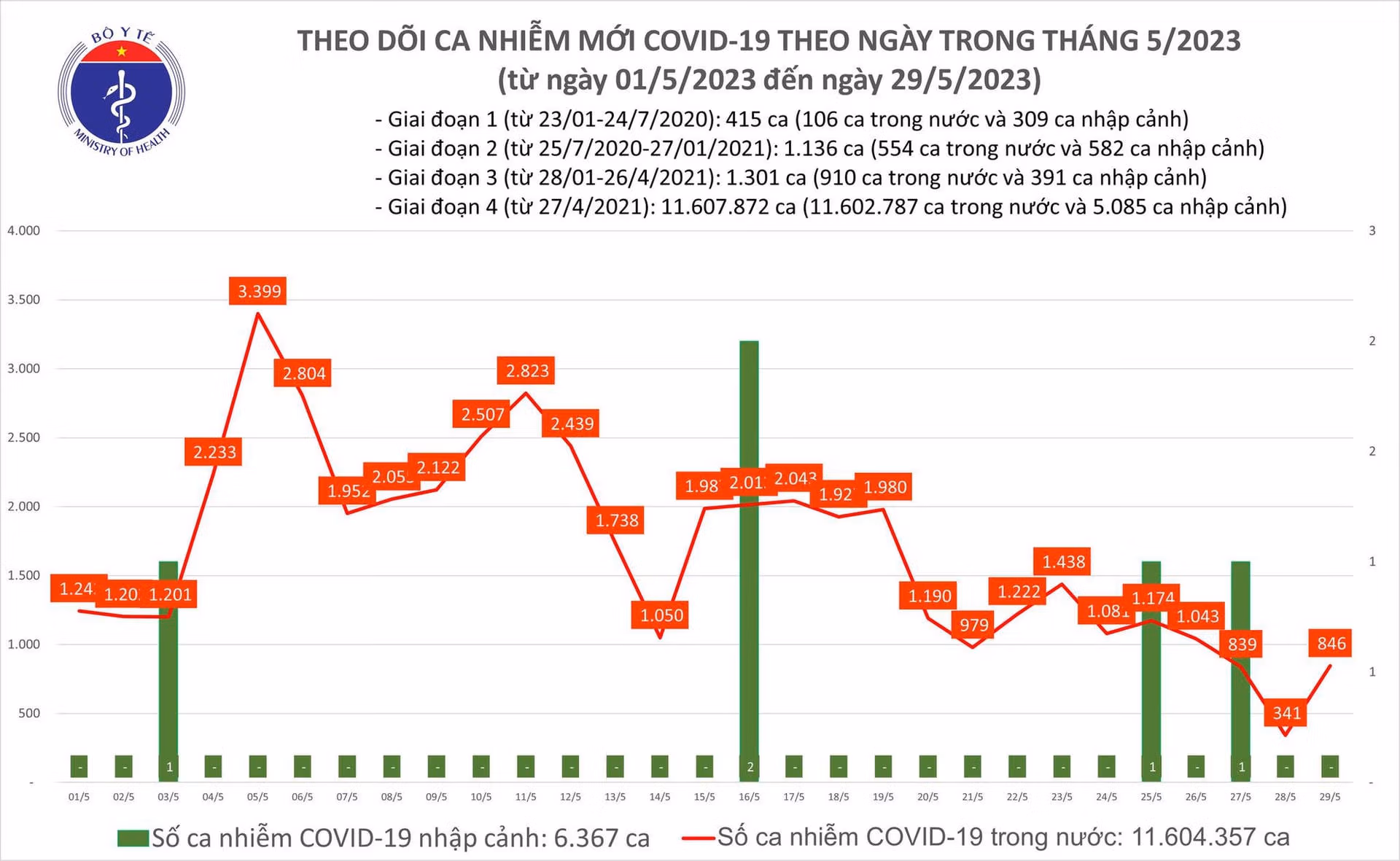 Bản tin phòng chống dịch Covid-19 ngày 29/5 của Bộ Y tế cho biết có 846 ca mắc mới Covid-19, gấp gần 3 lần so với ngày trước đó. Hôm nay có 131 ca khỏi, hiện còn 35 bệnh nhân đang thở oxy.