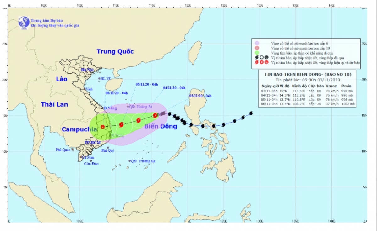 Theo dự báo, ngày 5/11, bão số 10 sẽ suy yếu do tác động của bề mặt đất, độ ẩm và năng lượng của bão giảm và đổ bộ vào đất liền các tỉnh Quảng Ngãi đến Khánh Hòa.