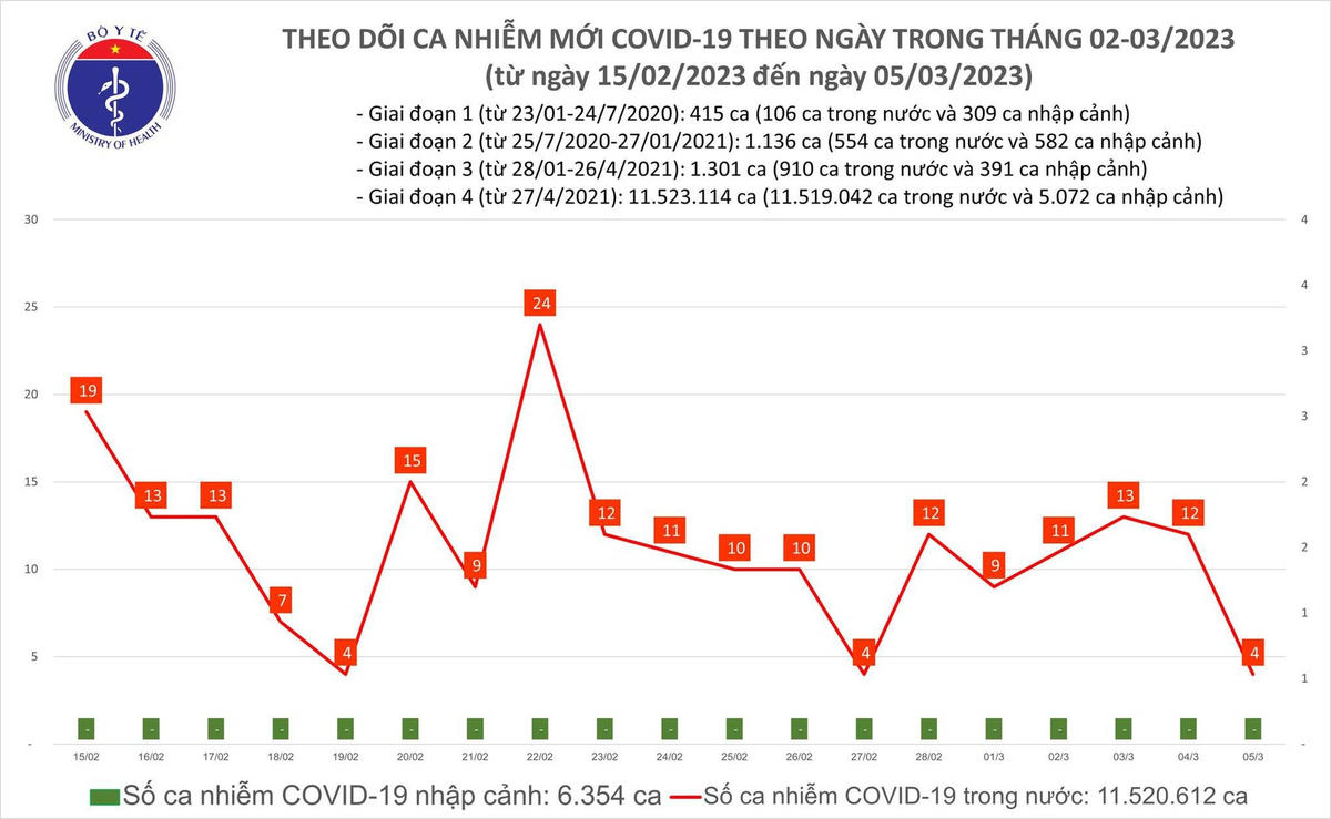 Bản tin phòng chống dịch Covid-19 ngày 5/3 của Bộ Y tế cho biết, có 4 ca mắc mới Covid-19, giảm mạnh so với hôm qua; Ca Covid-19 nặng tăng.