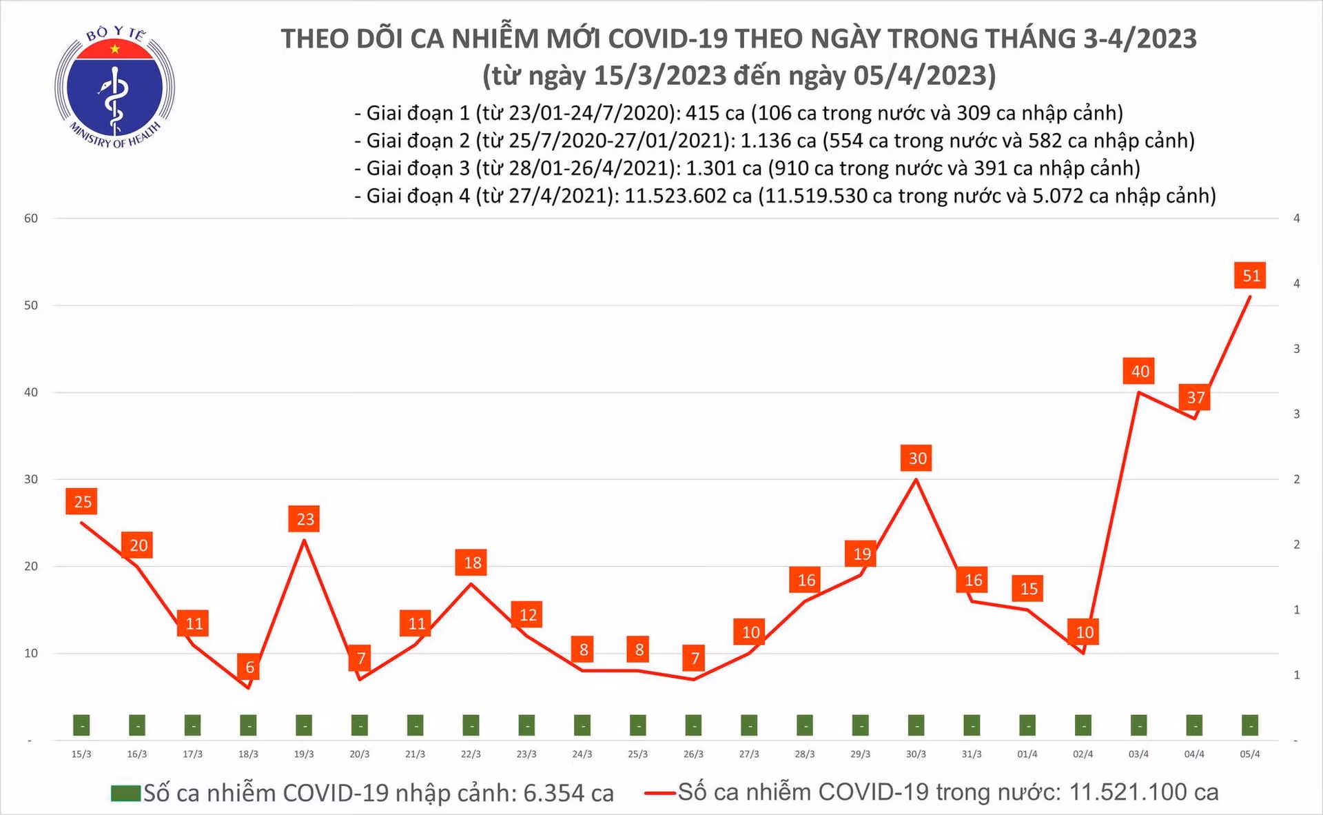 Bản tin phòng chống dịch Covid-19 ngày 5/4 của Bộ Y tế cho biết có 51 ca mắc Covid-19, cao nhất trong gần 2 tháng qua; trong ngày có 23 bệnh nhân khỏi; ca nặng tiếp tục tăng.