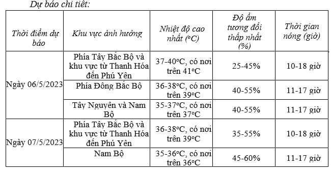 Trung tâm dự báo, ở phía Tây Bắc Bộ và khu vực từ Thanh Hóa đến Phú Yên ngày 6/5 tiếp tục xảy ra nắng nóng gay gắt và đặc biệt gay gắt với nhiệt độ cao nhất phổ biến 37-40 độ, có nơi trên 41 độ; độ ẩm tương đối thấp nhất 25-45%; ngày 7/5 có nắng nóng và nắng nóng gay gắt, có nơi đặc biệt gay gắt với nhiệt độ cao nhất phổ biến 36-38 độ, có nơi trên 39 độ; độ ẩm tương đối thấp nhất 35-55%.