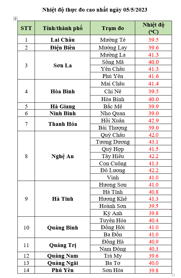 Trung tâm Dự báo khí tượng thủy văn quốc gia cho biết, ngày hôm qua (5/5), ở phía Tây Bắc Bộ và khu vực từ Thanh Hóa đến Phú Yên đã xảy ra nắng nóng gay gắt và đặc biệt gay gắt với nhiệt độ cao nhất phổ biến 37-40 độ, có nơi trên 41 độ như: Mường La (Sơn La) 41.3 độ, Yên Châu (Sơn La) 41.3 độ, Phù Yên (Sơn La) 41.6 độ, Hồi Xuân (Thanh Hóa) 42.9 độ, Con Cuông (Nghệ An) 41.3 độ, Tây Hiếu (Nghệ An) 42.2 độ, Tương Dương (Nghệ An) 43.1 độ, Quỳ Châu (Nghệ An) 42 độ, Quỳ Hợp (Nghệ An) 41.2 độ, Đô Lương (Nghệ An) 42.2 độ, Vinh (Nghệ An) 41 độ, Hương Khê (Hà Tĩnh) 41.3 độ,…độ ẩm tương đối thấp nhất phổ biến 35-50%. Ở phía Đông Bắc Bộ, Tây Nguyên và Nam Bộ có nắng nóng với nhiệt độ lúc 13 giờ phổ biến 35-37 độ, có nơi trên 37 độ; độ ẩm tương đối thấp nhất phổ biến 45-60%.