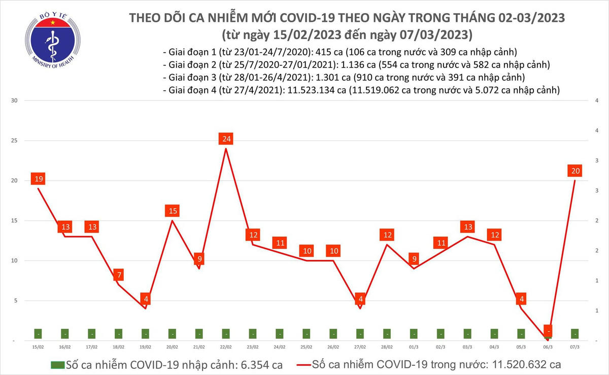 Bản tin phòng chống dịch Covid-19 ngày 7/3 của Bộ Y tế cho biết, có 20 ca mắc mới, cao nhất trong hơn 2 tuần qua. Trong ngày có 12 bệnh nhân khỏi. Cả nước còn 3 bệnh nhân nặng đang điều trị.