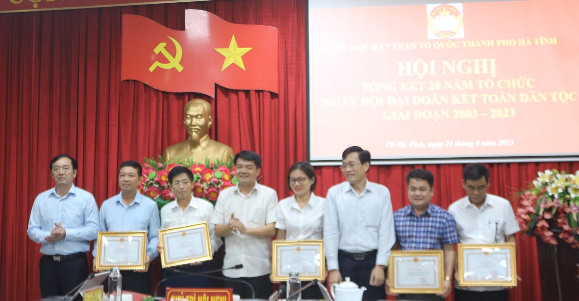 Dịp này, UBND, Ủy ban MTTQ thành phố Hà Tĩnh tặng giấy khen cho 16 tập thể và 5 cá nhân đã có thành tích trong tổ chức thực hiện Ngày hội Đại đoàn kết toàn dân tộc giai đoạn 2003-2023.