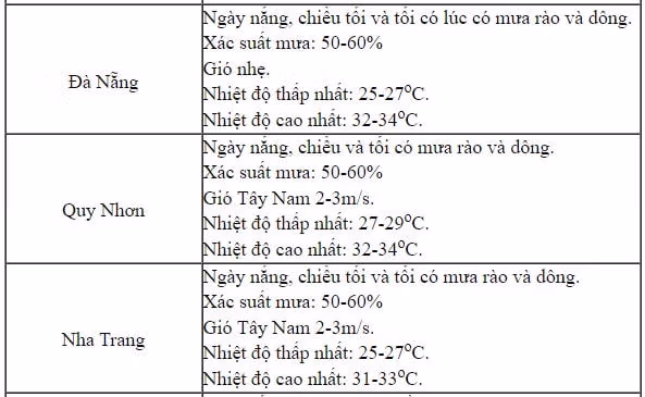 Khu vực từ Đà Nẵng đến Bình Thuận: Ngày 5/9 ngày nắng, chiều tối và tối có mưa rào và dông rải rác, đêm có mưa dông cục bộ. Nhiệt độ thấp nhất 24-27 độ, cao nhất ngày phổ biến 32-35 độ. Trong mưa dông có khả năng xảy ra lốc, sét và gió giật mạnh.