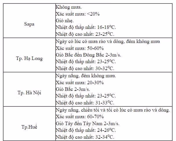 Khu vực từ Thanh Hóa đến Thừa Thiên Huế: Ngày 5/9 ngày nắng, chiều tối và tối có mưa rào và dông rải rác, đêm có mưa dông cục bộ. Nhiệt độ thấp nhất 24-27 độ, cao nhất ngày phổ biến 31-34 độ.