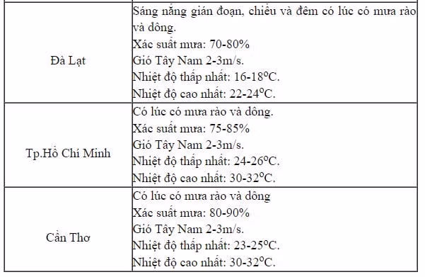 Khu vực Tây Nguyên và Nam Bộ: Ngày 5/9 có mưa rào và dông, cục bộ có mưa to (thời gian mưa tập trung vào chiều và đêm). Nhiệt độ thấp nhất khu vực Tây Nguyên 20-23 độ, cao nhất ngày ở Tây Nguyên phổ biến 27-30 độ; ở khu vực Nam Bộ nhiệt độ thấp nhất 23-26 độ, cao nhất 30-33 độ. Trong mưa dông có khả năng xảy ra lốc, sét và gió giật mạnh.