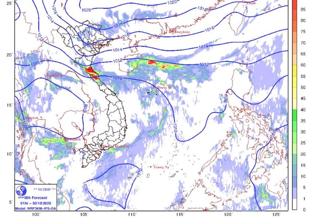 Từ ngày mai (30/10) đến ngày 31/10 ở các tỉnh từ Quảng Trị đến Quảng Ngãi có mưa vừa, mưa to, có nơi mưa rất to với tổng lượng mưa phổ biến 50-150 mm/đợt, có nơi trên 200 mm/đợt.