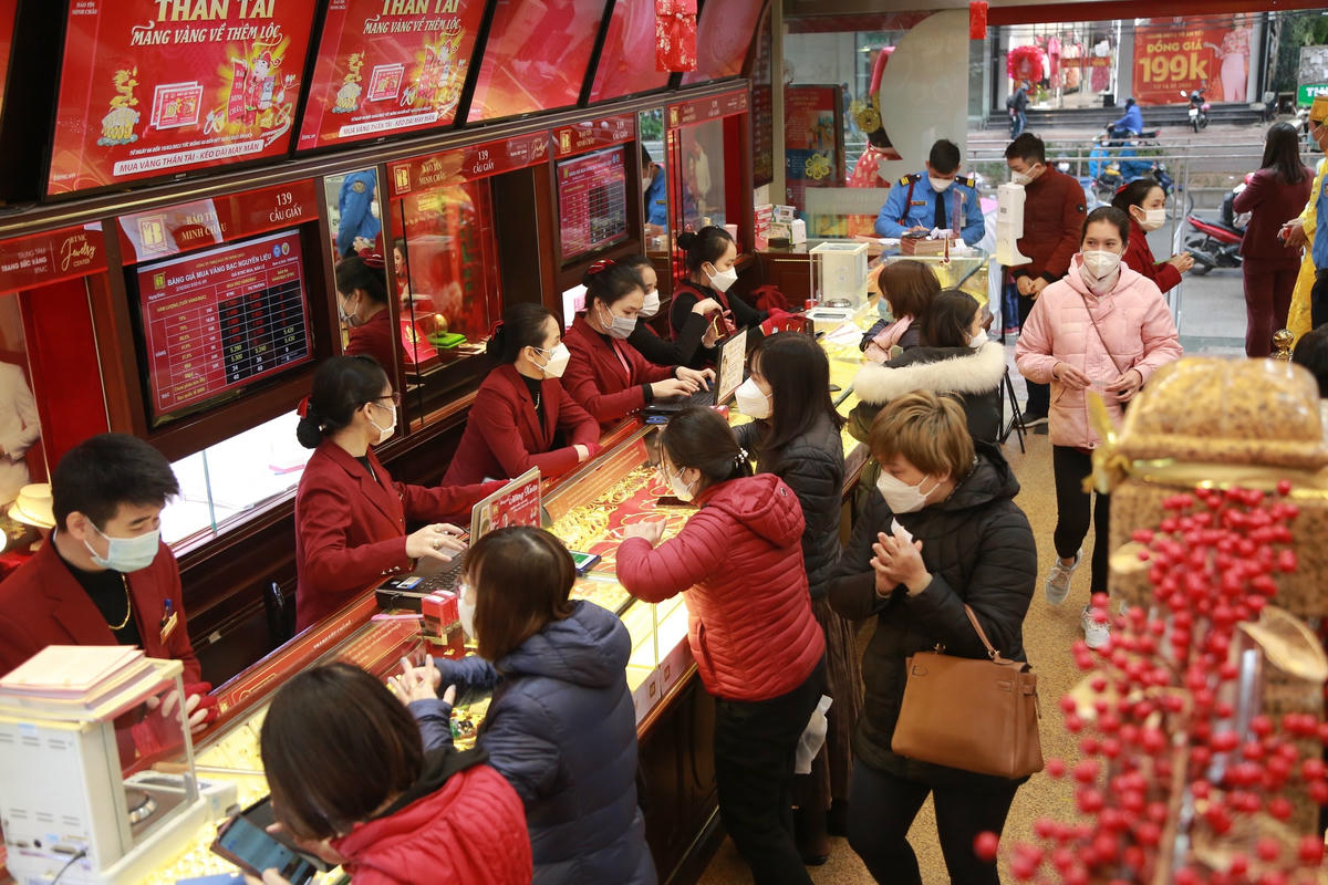 Ghi nhận PV Đại Đoàn Kết Online sáng 10/2, tại nhiều cửa hàng vàng trên địa bàn Hà Nội, số lượng khách mua vàng tăng mạnh so với những ngày trước đó, tuy nhiên không quá đông đúc như mọi năm.
