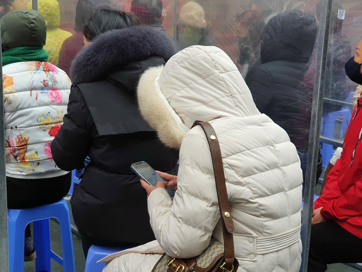 Tại cửa hàng vàng Bảo Tín Minh Châu (đường Cầu Giấy), người mua vàng xếp hàng từ sáng sớm bất chấp trời mưa rét.