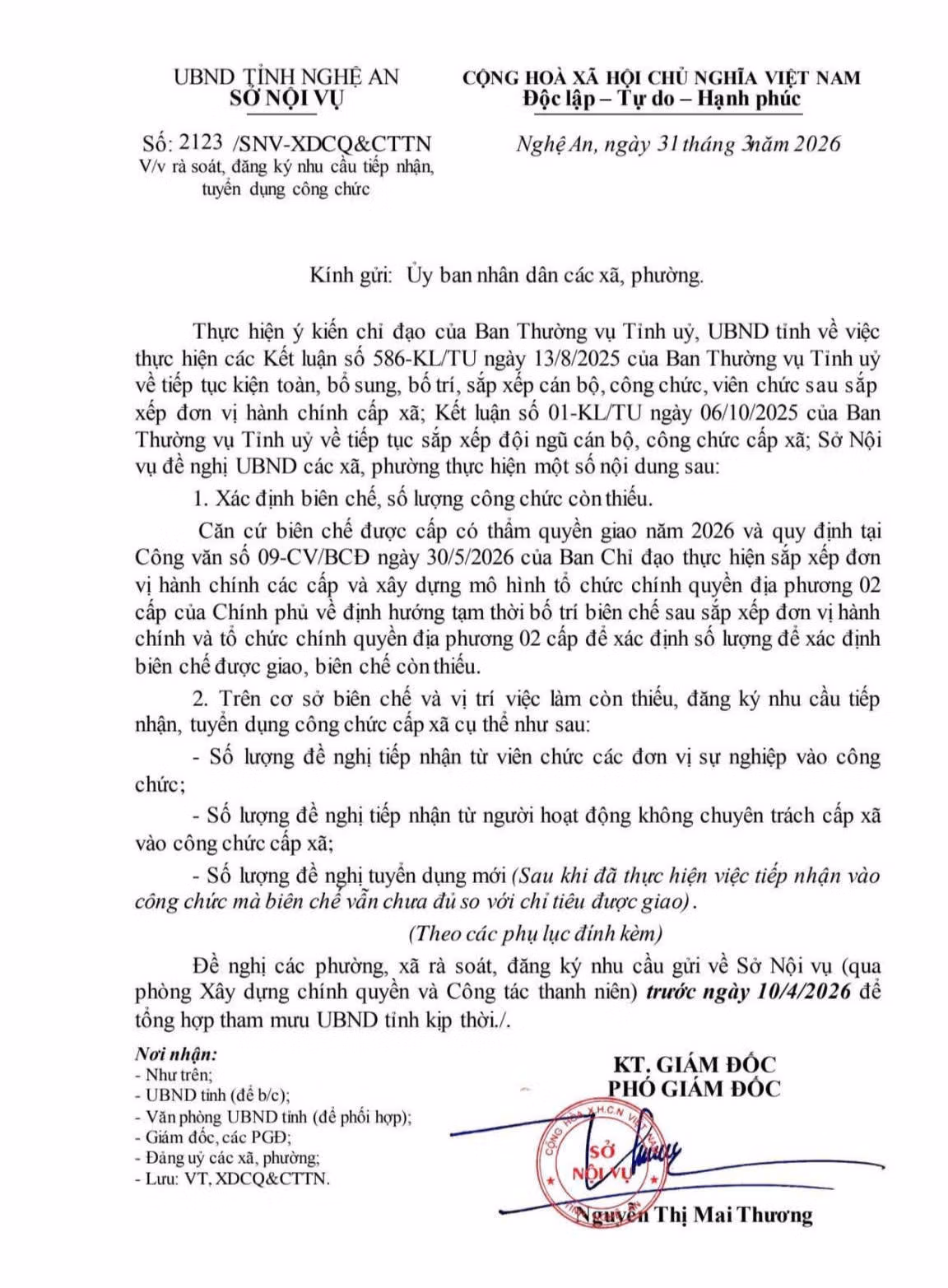 Ngày 31/3, bà Nguyễn Thị Mai Thương, Phó Giám đốc Sở Nội vụ Nghệ An, ký Công văn số 2123 về việc rà soát, đăng ký nhu cầu tiếp nhận, tuyển dụng công chức cấp xã.