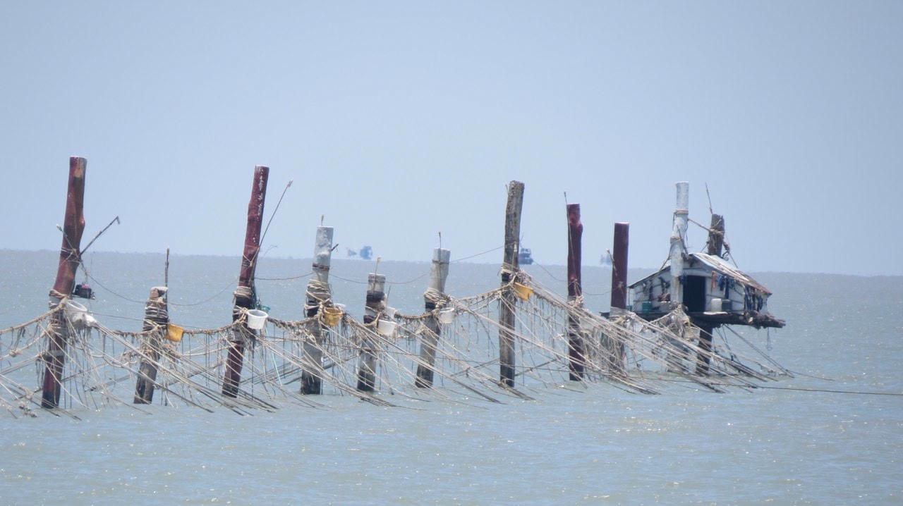 Di chuyển chừng 30 phút là tới khu vực đóng đáy. Theo quan sát của chúng tôi, chòi canh đáy của ông Huân chỉ rộng chừng 6 mét vuông, được chằng buộc bằng dây, gỗ tràm vào chính hàng đáy. Ông Huân bảo “bạn đáy”, tức người trông coi hàng đáy là anh Út, 34 tuổi ngụ ở thị trấn Vàm Láng (huyện Gò Công Đông).