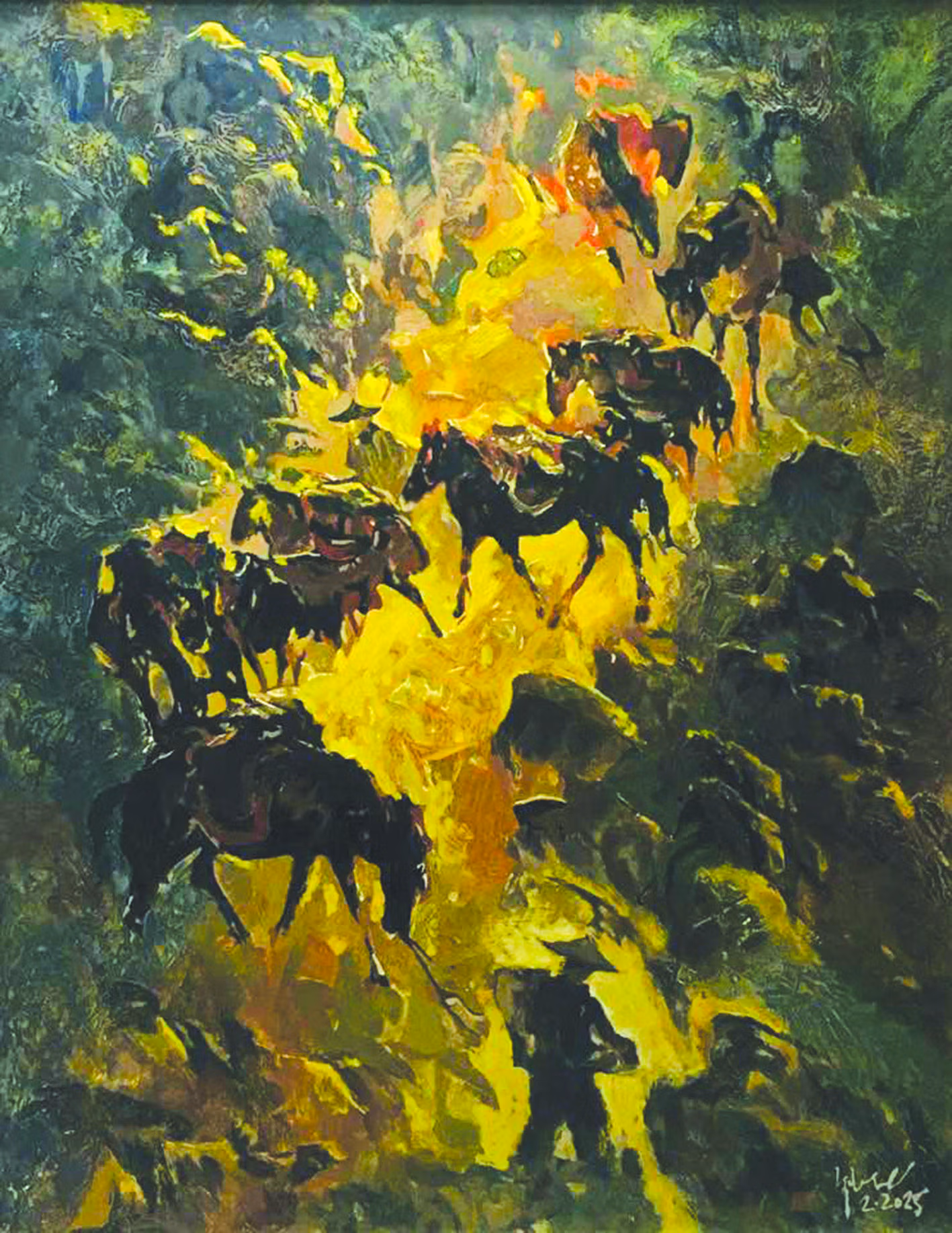 Có một điều tôi luôn thấy rõ mỗi lần gặp họa sĩ Đỗ Đức: ông không chỉ là người vẽ phong cảnh, mà là người mang trong mình ký ức của núi rừng. Xem tranh ông, có lúc tôi nghĩ: nếu bỏ đi những con ngựa bé nhỏ ấy, núi vẫn còn đó, sương vẫn còn đó, nhưng đời sống thiếu vắng và cô liêu hơn. Những bức tranh gần đây của Đỗ Đức, người ta thấy ngựa ngày càng trầm lắng. Dáng thấp hơn, bước chậm hơn, như thể mang theo cả nhịp thở của người họa sĩ đã đi qua phần lớn đời mình. Đó không còn là cái nhìn của một người say mê khám phá, mà là cái nhìn của một người đã hiểu, đã chấp nhận, và không còn cần phải chứng minh điều gì nữa.