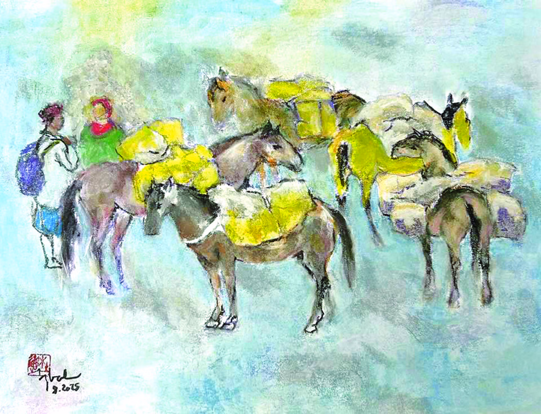 Trong tranh Đỗ Đức, phong cảnh vùng cao không chỉ có núi, có mây, có đá. Ẩn trong lớp sương xa đá núi, luôn thấp thoáng những con ngựa lầm lũi, chậm rãi, mang theo nhịp sống miền biên viễn. Vẽ ngựa, với họa sĩ Đỗ Đức, không phải để nói về con giáp, mà để kể chuyện con người. Ở đó, ngựa không phải biểu tượng, mà là sự sống, sự sẻ chia…
