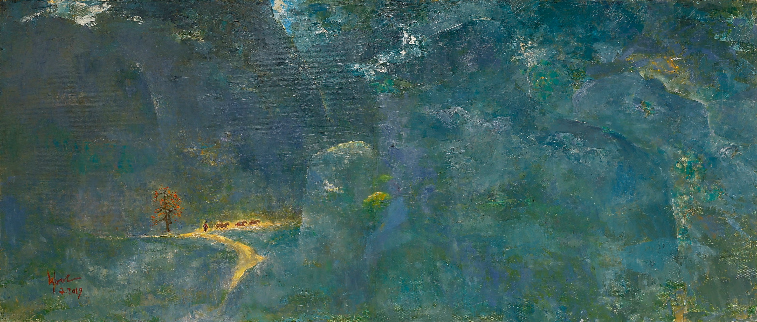 Các bức tranh “Trong núi”, “Chiều bên núi”, “Một nẻo biên thùy II”, “Nắng sớm trên đỉnh Pu Sam Sao”, “Cuộc sống cao nguyên”, “Cổ tích miền rừng”…, như một dấu hiệu nhận ra sự sống đang vận động giữa mênh mang đá núi và sương xa. Có khi là dáng ngựa lọt thỏm giữa sắc xanh bàng bạc của sơn khê (Mùa Xuân). Có khi ngựa đi cùng người, thành những bạn đồng hành lặng lẽ: người gùi măng, sắn nặng trĩu, ngựa thồ củi lún lưng. Cả hai cùng cúi đầu, bước đi trong chiều sâu hun hút của điệp trùng đá núi, như trong “Chiều bên núi”, “Đường vào Khau Vai”.
