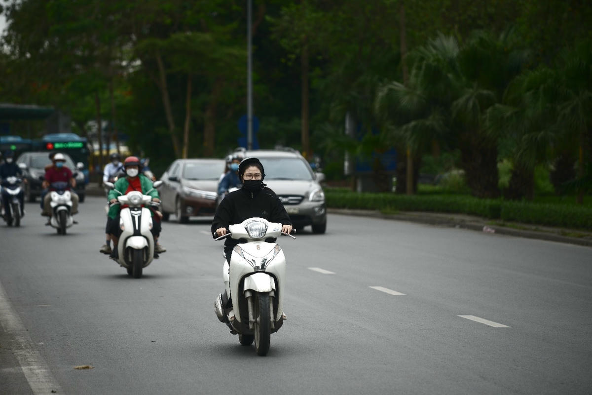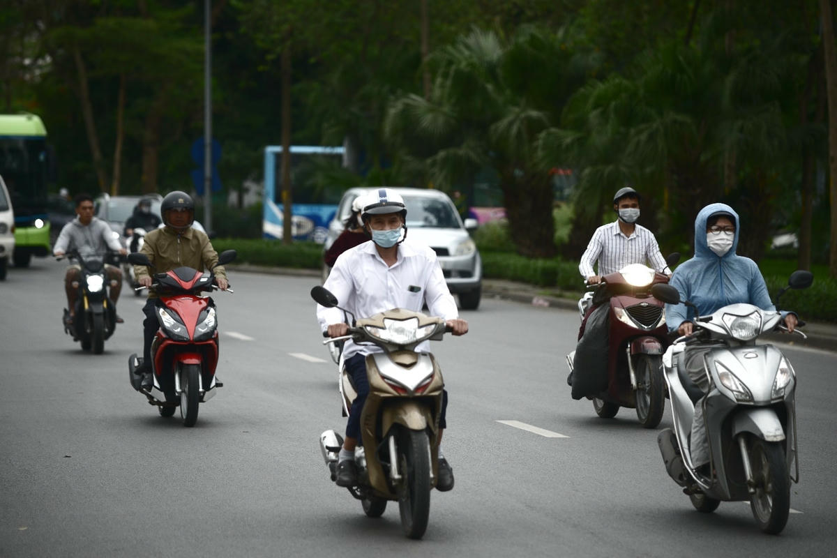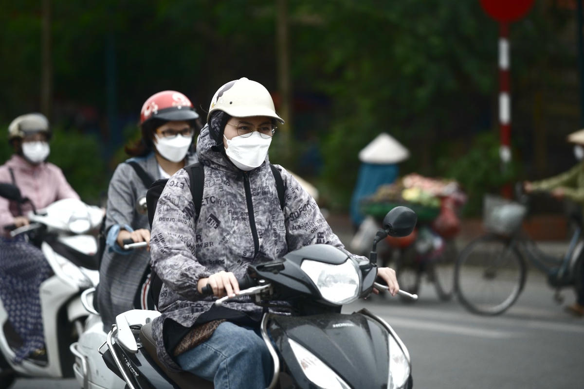 Sáng sớm nay, do ảnh hưởng của không khí lạnh đã khiến không ít người dân Hà Nội co ro khi ra đường, nhiều người đi xe máy phải mặc áo ấm.