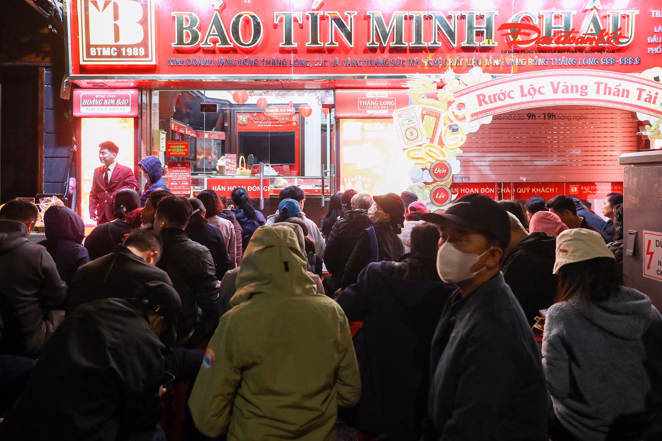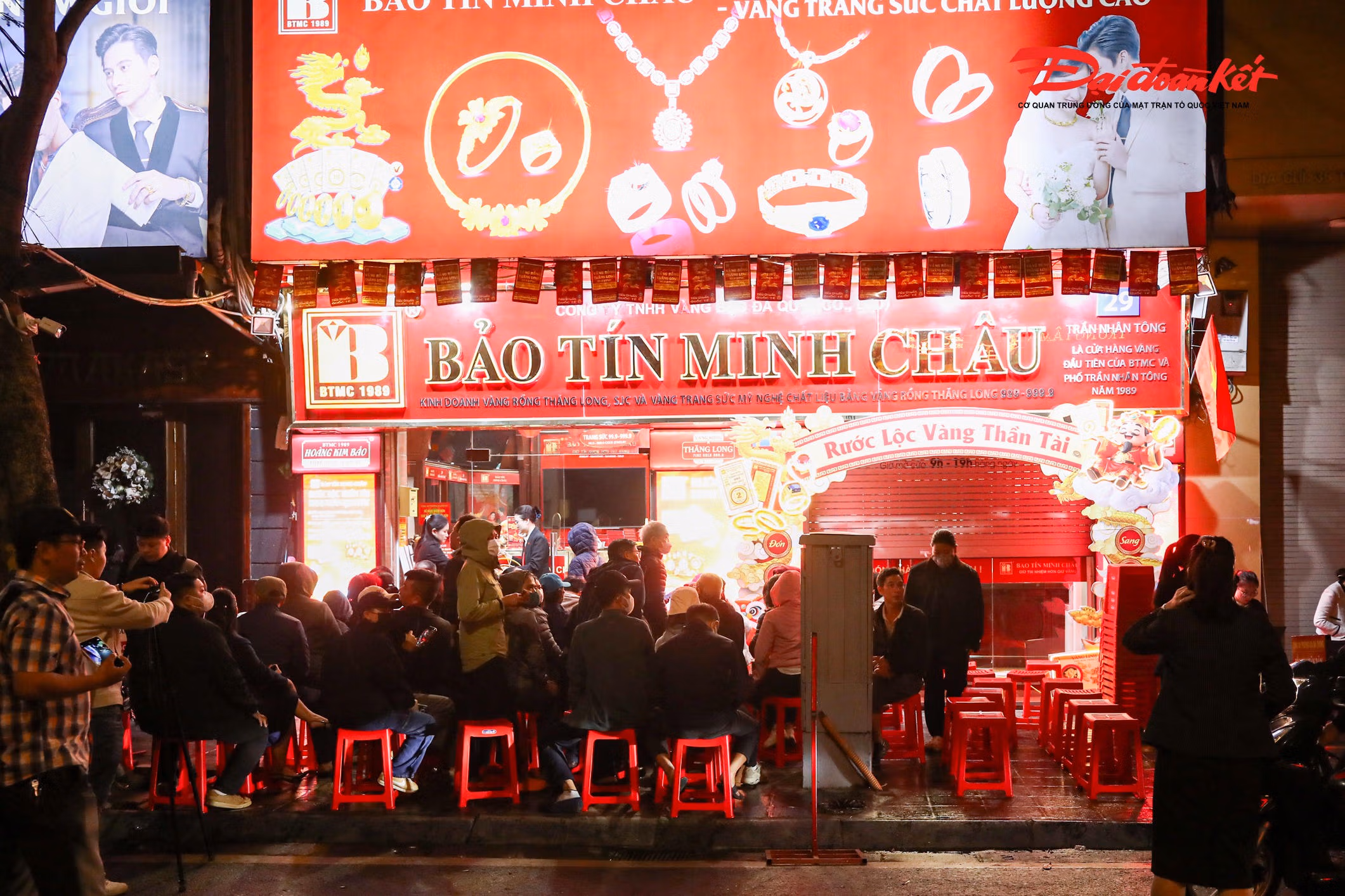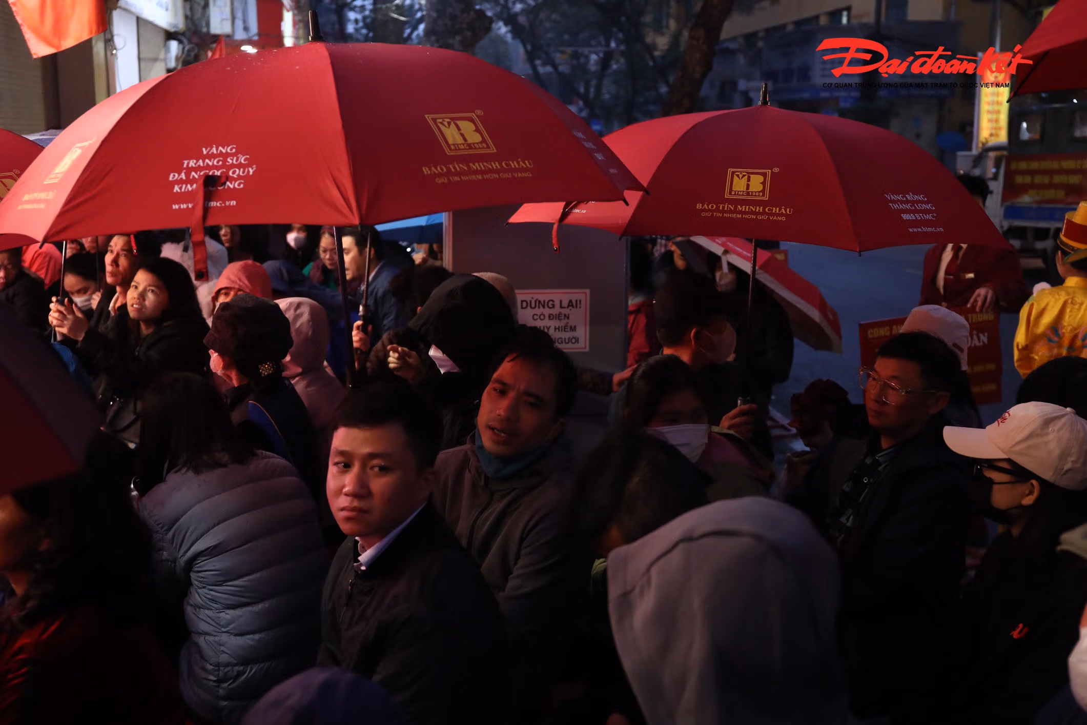 Khoảng 5h30 sáng, khu vực chờ trước cửa hàng vàng Bảo Tín Minh Châu đã chật kín người, bất chấp thời tiết giá lạnh và mưa phùn lất phất.