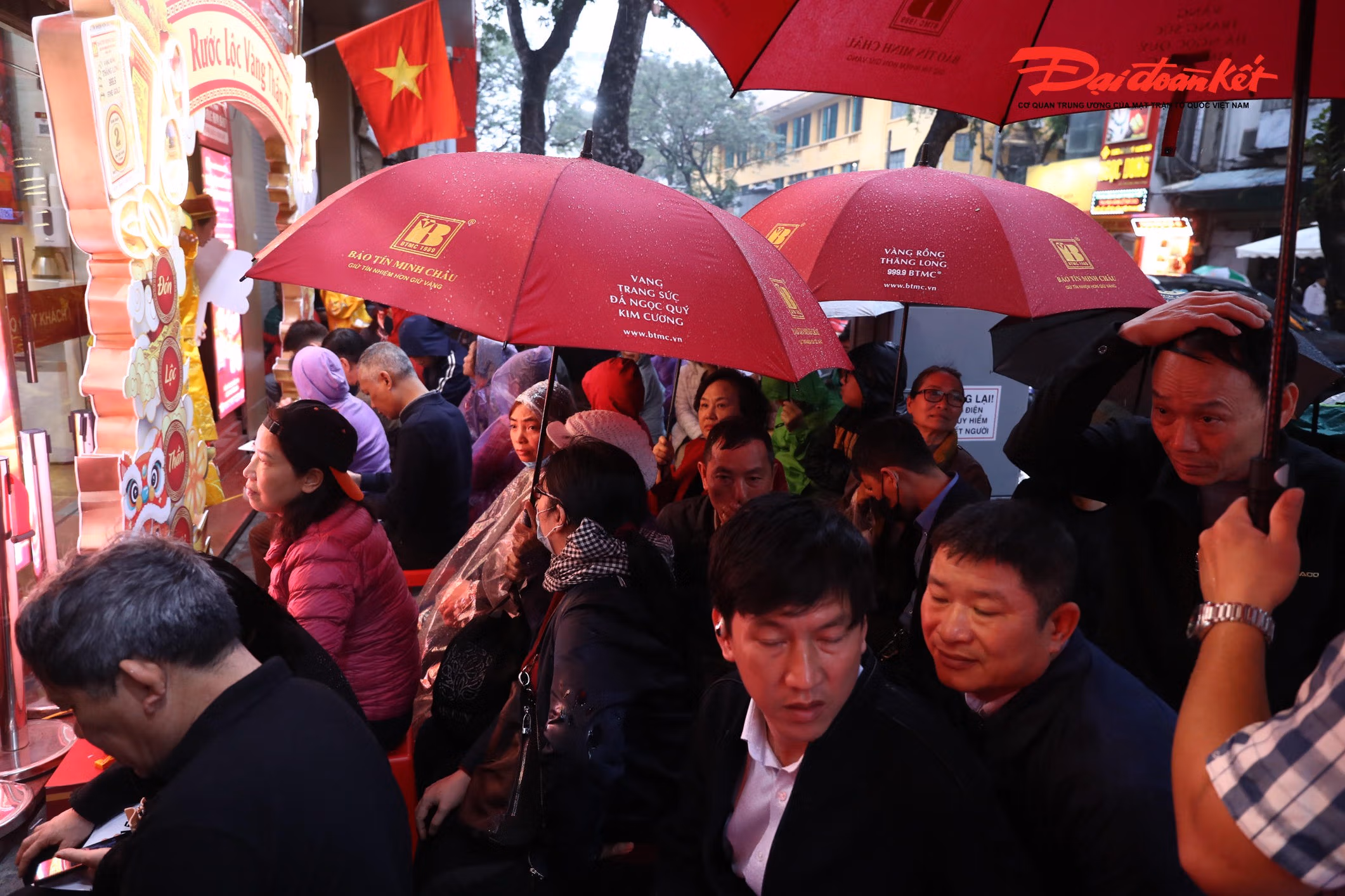 Đến khoảng 8h, mưa nặng hạt hơn nhưng nhiều khách vẫn kiên nhẫn đội mưa, ngồi chờ đến lượt mua vàng với hy vọng lấy lộc đầu năm.