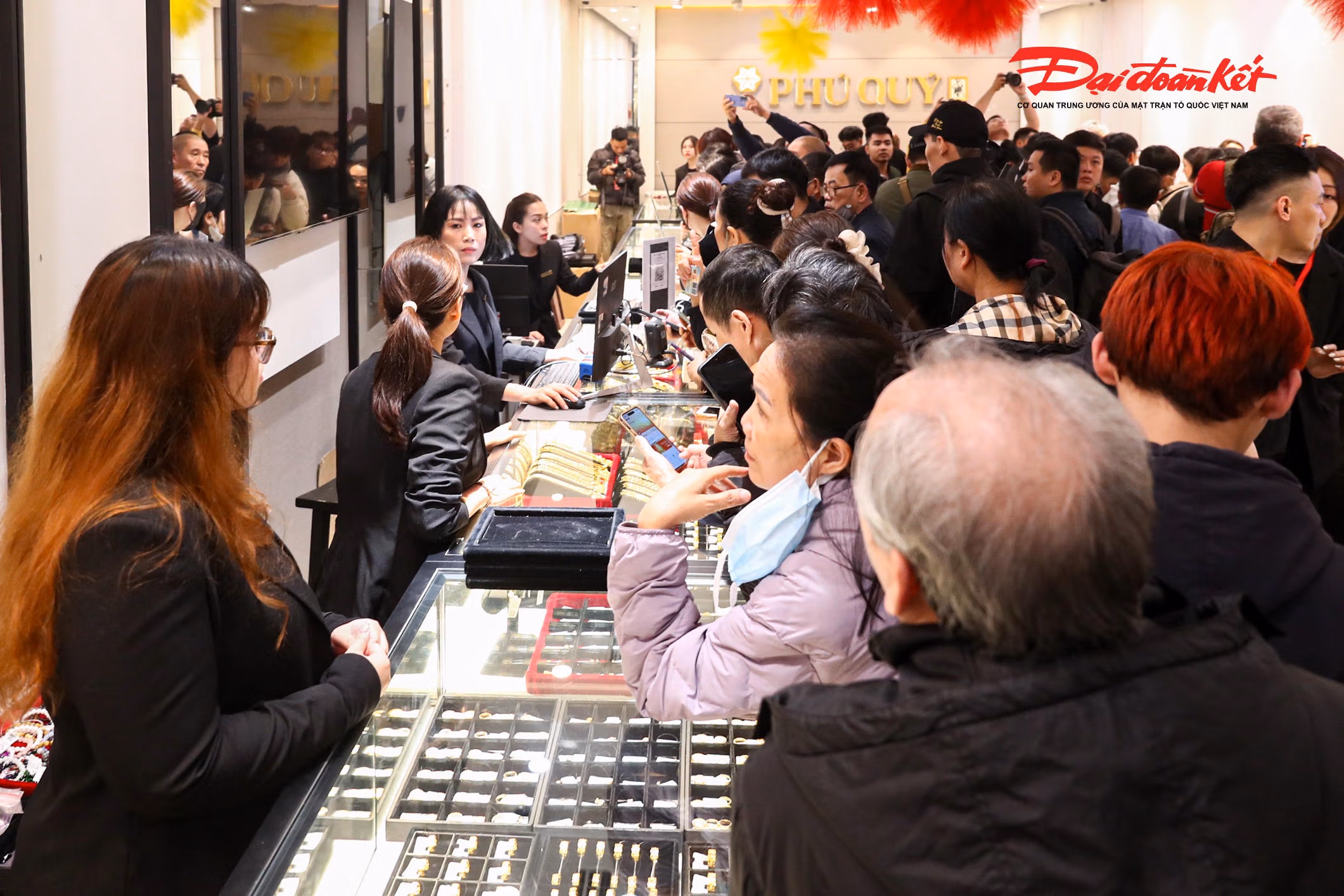 Khoảng 6h–6h30 sáng, các cửa hàng đồng loạt mở cửa, dòng khách xếp hàng từ sớm nhanh chóng di chuyển vào bên trong để thực hiện giao dịch mua vàng.