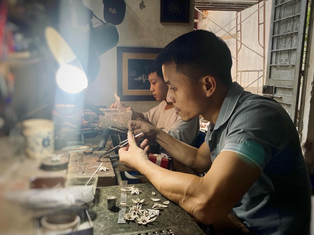 Nằm bên cạnh đền thờ tổ nghề kim hoàn, ngôi nhà xưởng rộng chừng 30m2 là nơi nghệ nhân Quách Phan Tuấn Anh cùng nhân viên của mình đang chăm chú làm việc. Mỗi người một tác phẩm riêng, người làm tranh hoa sen, người làm chùa Một Cột... Vẻ say mê hiện rõ trên khuôn mặt của từng người…