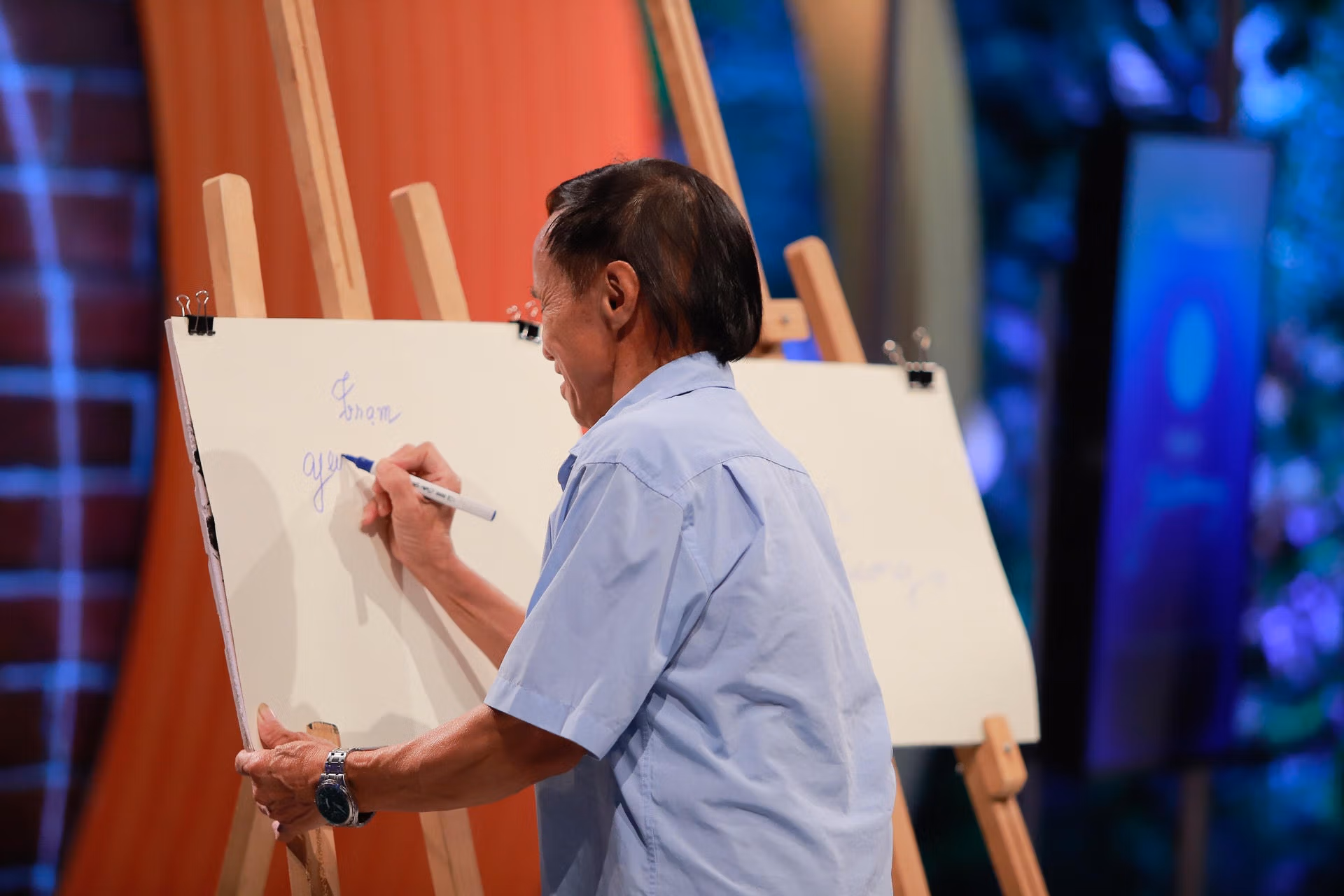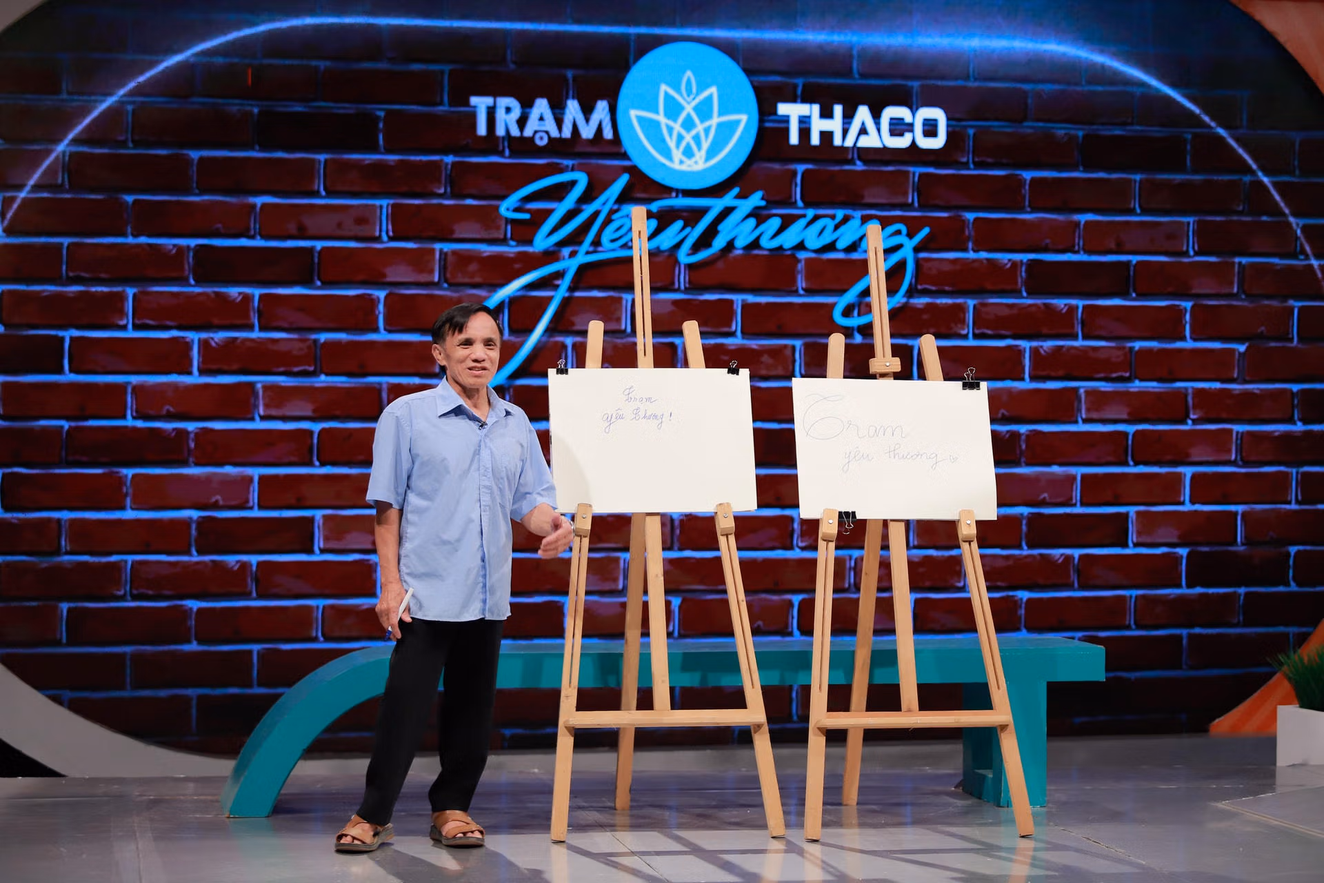 Xuất hiện trên sân khấu "Trạm yêu thương" với tấm bảng viết và cây bút, hai đồ vật quen thuộc trong các buổi dạy học, ông Dũng xúc động viết 3 từ “Trạm yêu thương”. Ông chia sẻ mình dạy Toán, không dạy Tiếng Việt nhưng lựa chọn tên chương trình, bởi hai từ “yêu thương” luôn khiến ông trân trọng và đầy cảm xúc khi được viết ra. Đó cũng là một trong ba từ khoá mà ông tâm đắc nhất trong quá trình dạy học của mình: “Kiên trì, tự hào và yêu thương”.