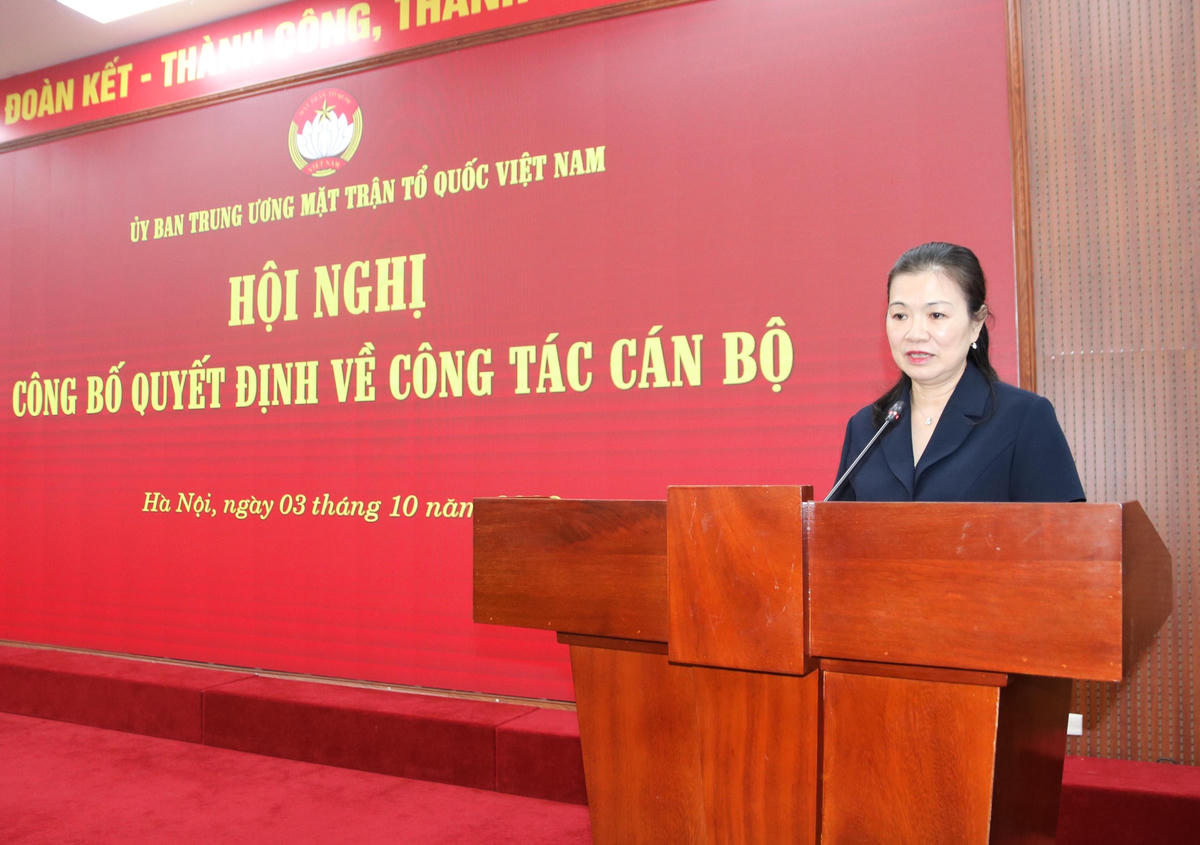 Ngày 3/10, tại Hà Nội, UBTƯ MTTQ Việt Nam đã tổ chức Hội nghị công bố quyết định về công tác cán bộ. Dự và chủ trì Hội nghị có bà Trương Thị Ngọc Ánh, Phó Chủ tịch UBTƯ MTTQ Việt Nam.
