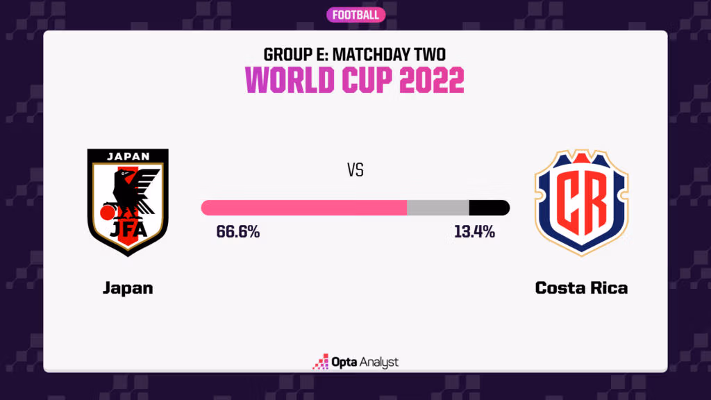 Thất bại nặng nề của Costa Rica trước Tây Ban Nha khiến họ chỉ được siêu máy tính của Opta trao 13,4% cơ hội chiến thắng. Khả năng Nhật Bản có 3 điểm là 66,6%, xác suất hai đội hòa là 20%.