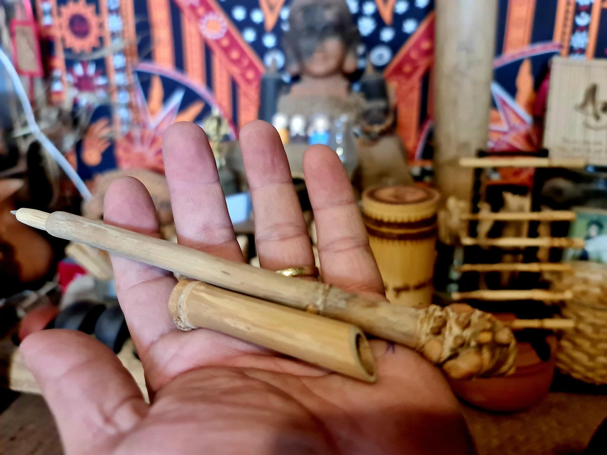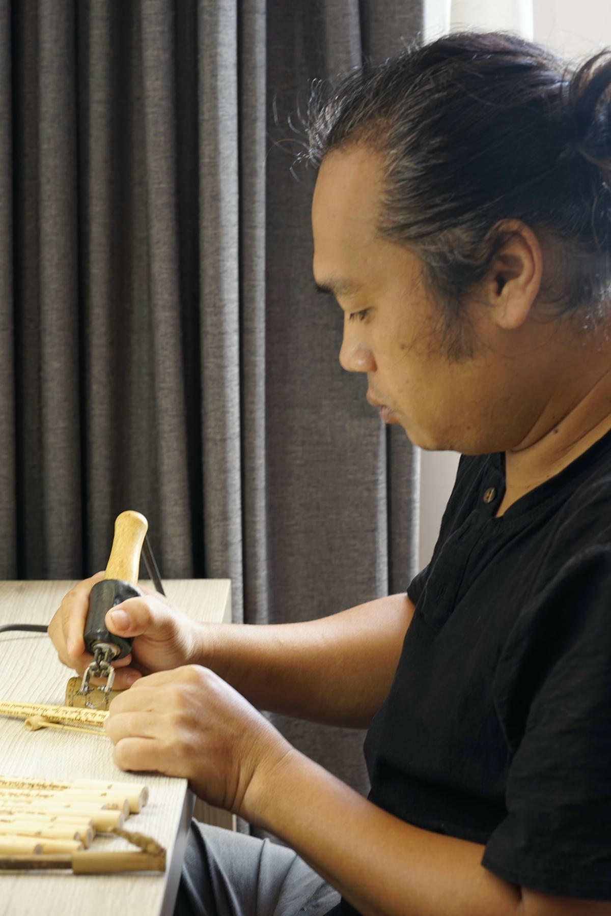 Anh Phận bật mí, để tạo ra một sản phẩm bút bi khắc chữ, trước hết anh tạo ra hình thù nguyên bản của bút bi gồm ngòi bút, ống mực, thân ống tre. Sau đó, anh Phận bắt đầu khắc theo hình đã được phác thảo sẵn, rồi thêm những dòng thơ, văn.