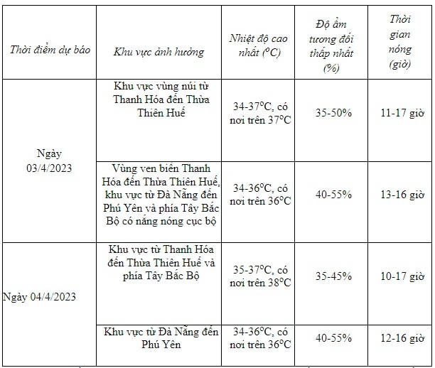 Khu vực từ Thanh Hóa đến Thừa Thiên - Huế có nắng nóng, có nơi nắng nóng gay gắt với nhiệt độ cao nhất phổ biến 35-37 độ, có nơi trên 38 độ; riêng vùng ven biển ngày 2/4 có nắng nóng cục bộ. Độ ẩm tương đối thấp nhất 35-50%.