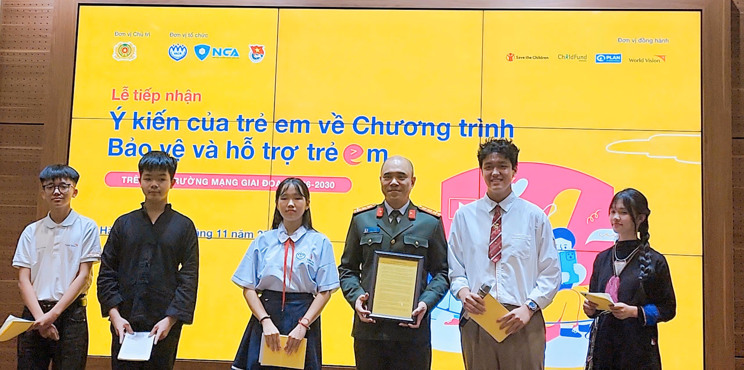 Phát biểu tại Lễ tiếp nhận, Đại tá Hà Văn Bắc, Phó Cục trưởng Cục An ninh mạng và phòng chống tội phạm sử dụng công nghệ cao (A05) cho biết, trước yêu cầu từng bước thực hiện thế hệ " công dân số" trong bối cảnh chuyển đổi số quốc gia đặc biệt thực hiện các quy định của Luật Trẻ em từ ngày 11/11/2025 đến ngày 20/11/2025 Cục A05 đã phối hợp với Hội Bảo vệ quyền trẻ em Việt Nam, Trung ương Đoàn Thanh niên cộng sản Hồ Chí Minh, với sự hỗ trợ của các tổ chức quốc tế, triển khai hoạt động tham vấn, lấy ý kiến đối với gần 2.800 trẻ em tại 16 tỉnh, thành phố.