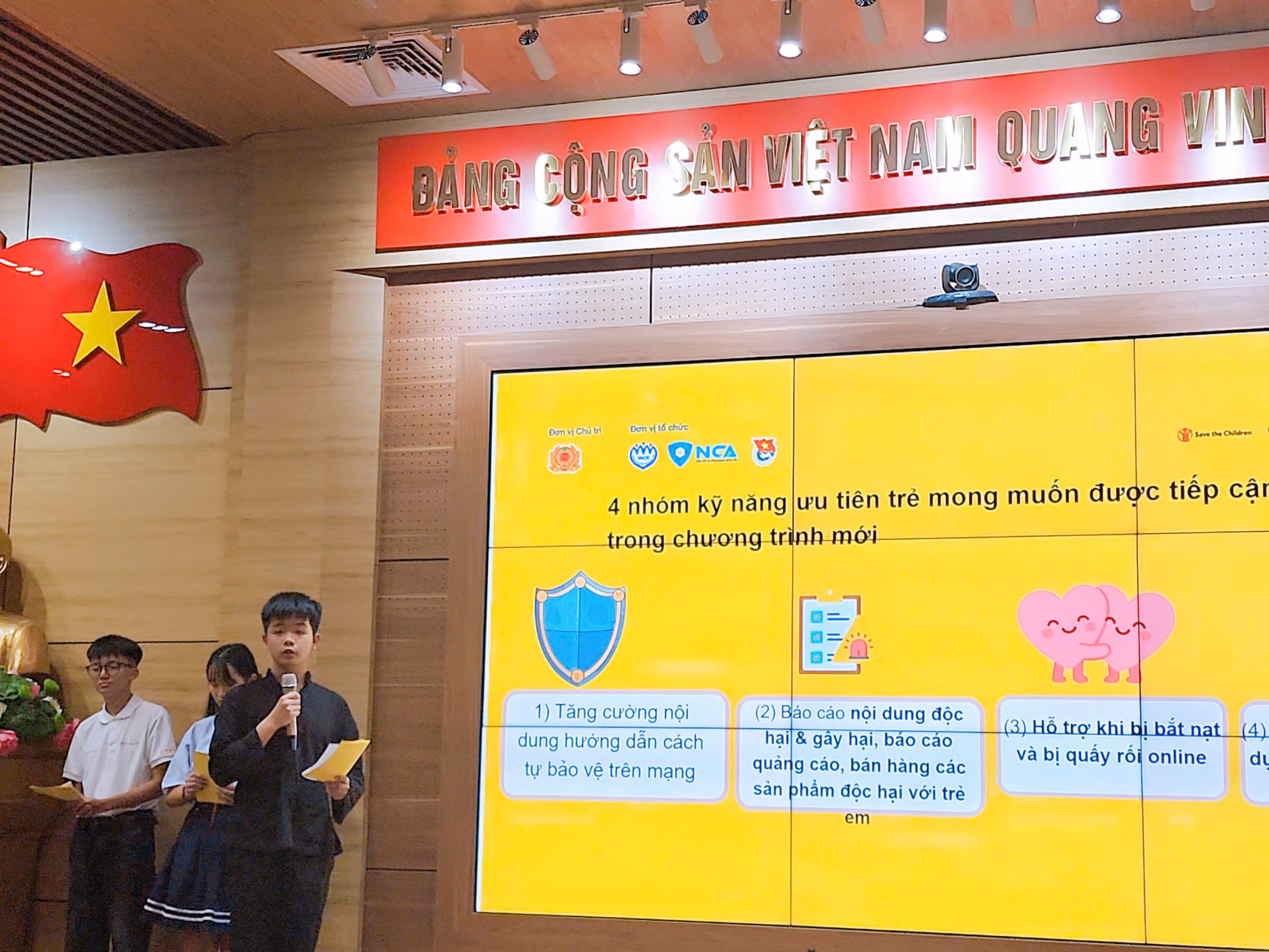 Chia sẻ tại lễ tiếp nhận, cháu Kim Hà Ngọc Tân, học sinh lớp 9 trường THCS Luận Thành, tỉnh Thanh Hóa cho rằng, trong thời đại số hôm nay, không gian mạng mở ra cho trẻ em những cơ hội khám phá nguồn kiến thức khổng lồ song cũng tiềm ẩn nhiều rủi ro. Chính vì vậy, em mong muốn học kỹ năng tự bảo vệ trên không gian mạng; các rủi ro được phát hiện và xử lý kịp thời trước khi xảy ra.