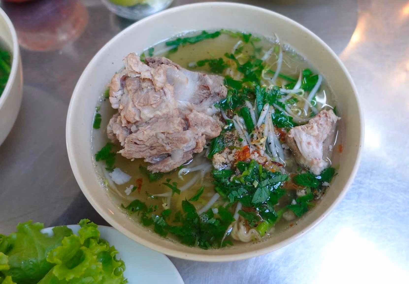 Theo người phụ nữ này, bí quyết của việc làm hủ tiếu ngon là phải chọn xương thịt ngon. “Tôi bán ở đây không có tên quán, bảng hiệu gì nhưng toàn khách quen thôi. Bán giá bình dân, chỉ 25.000 đồng/1 tô xương giò và 20.000 đồng/1 tô thịt thái lát. Mấy cô chú công nhân ở đây tăng ca xin thêm nhiều hủ tiếu, nhiều rau mà tôi cũng lấy giá như vậy. Mình phải làm ngon để họ ăn chứ không phải bán lấy đồng tiền rồi thôi”, bà Ba chia sẻ.