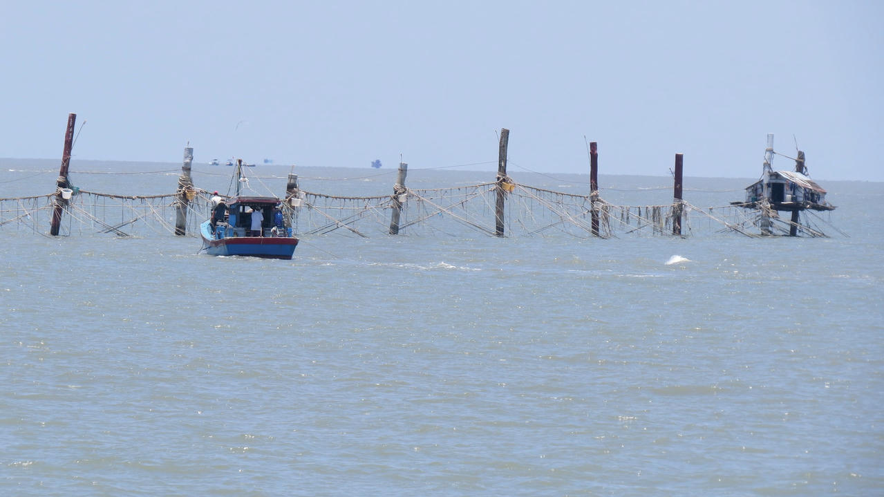 Vừa nhìn theo tay người ngư dân, chúng tôi thấy những hàng cọc dài được đóng bằng cây gỗ cừ lớn, có cả cây dừa già nữa, cao chừng 3m so với mực nước biển. Các cọc đáy này cách nhau chừng 5 - 6m, có rất nhiều dây nhợ lằng nhằng buộc chằng chịt. Ở phía cuối cọc đáy là một căn nhà rất nhỏ, nhìn xa xa như một chiếc tổ chim. Lúc này, anh Luân đã tắt máy, bắt đầu cho ghe chạy theo chớn và nói chuyện với mấy người đang ló đầu từ chiếc nhà nhỏ trên cọc đáy ra. Khi ghe gần tới, anh ném sợi dây thừng có buộc một quà cầu bằng chì to như trái bần lên nhà để buộc lại, rồi thả neo. Phải mất chừng 10 phút tôi mới có thể bước từ dưới ghe lên căn nhà rất nhỏ này với sự hỗ trợ của mấy người ngư dân. Phần vì sóng đánh khá mạnh khiến chiếc ghe cứ dập dềnh lên xuống.
